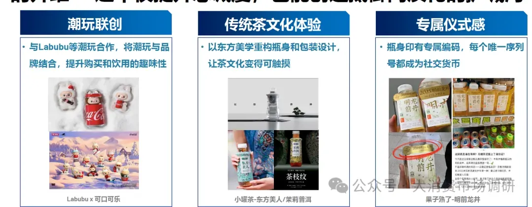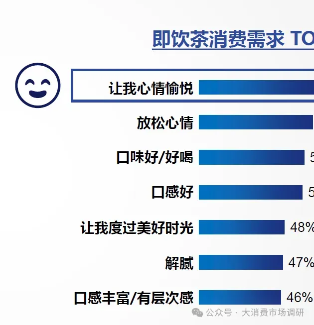 消费者对即饮茶的需求进一步向情感体验和感官享受深化,产品的基础解渴功能已让位于‘让我心情愉悦’的核心价值。情绪满足、口味优化成为关键购买驱动力,而‘提神/解腻’等传统功能属性逐渐边缘化。