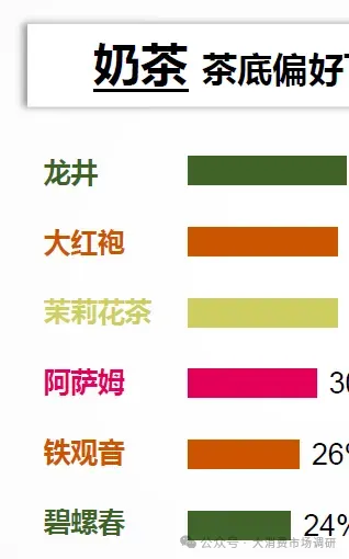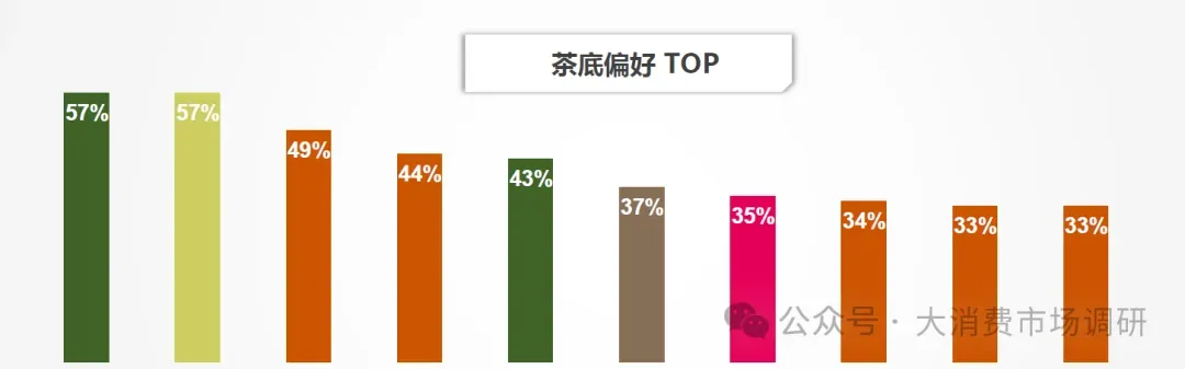 茶基底上,龙井和茉莉花最受消费者喜爱,其次是大红袍和铁观音