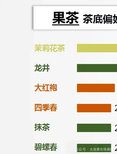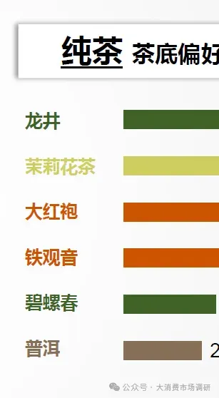 果茶的茶底,口感清新的茉莉花茶接受度最高;奶茶更偏好醇厚浓郁的茶底;而纯茶,韵味悠长的龙井是首选
