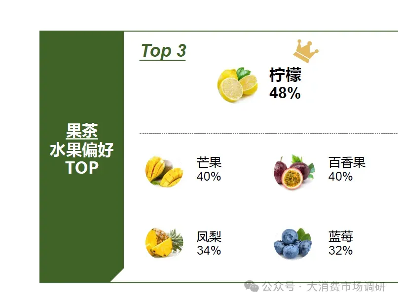果茶水果偏好上,柠檬和葡萄热度不减;热带水果类、柑橘类和莓果类形成三大风味阵营