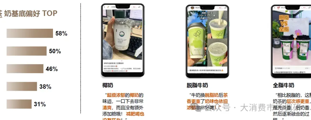 健康风潮下,椰奶以低脂清爽成为奶茶新宠,脱脂牛奶强化茶香且满足控卡需求,而全脂牛奶凭借醇厚口感坚守经典市场。