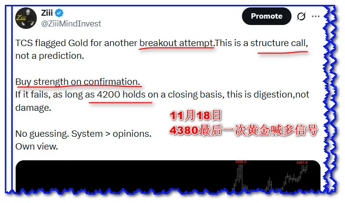 进场(2025年11月18日):TCS系统发出结构性多头信号,黄金$4,380。那时候市场还在讨论"黄金是不是见顶了"。我们的判断是:买强势突破,不猜顶底。