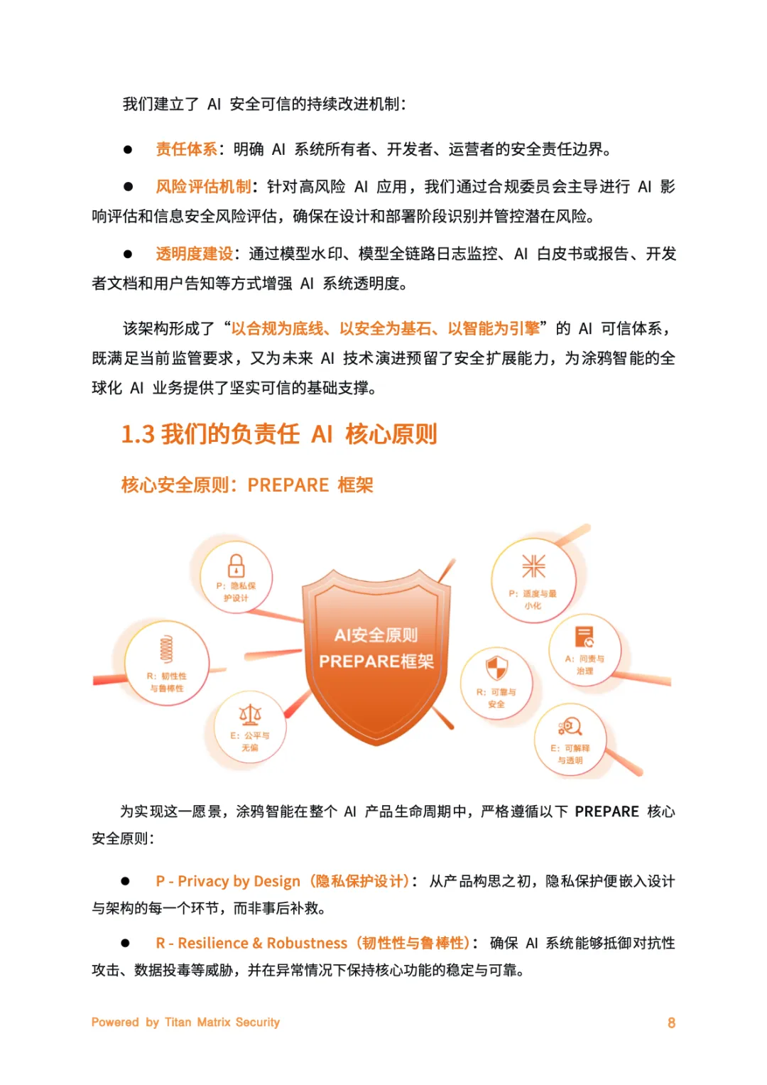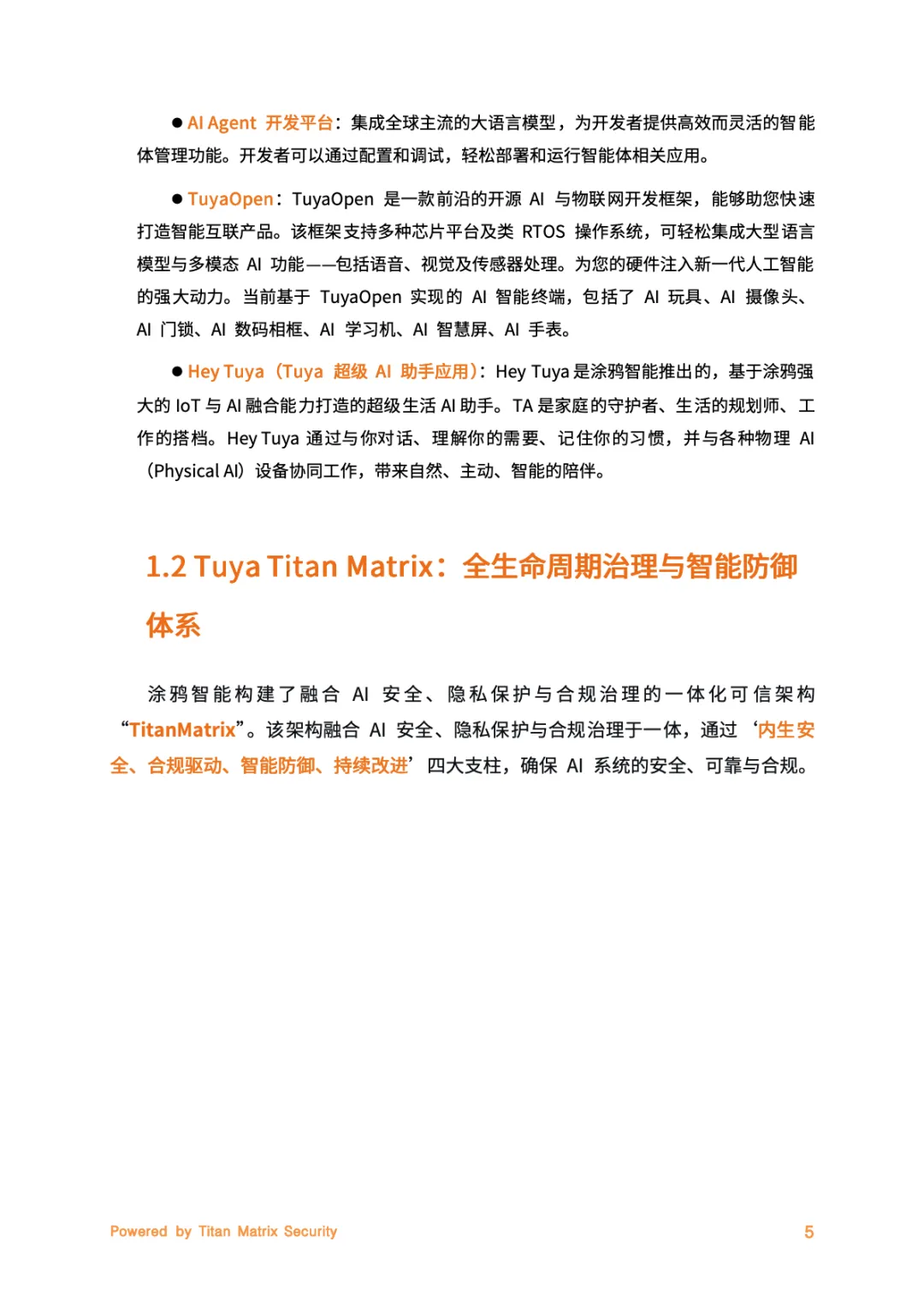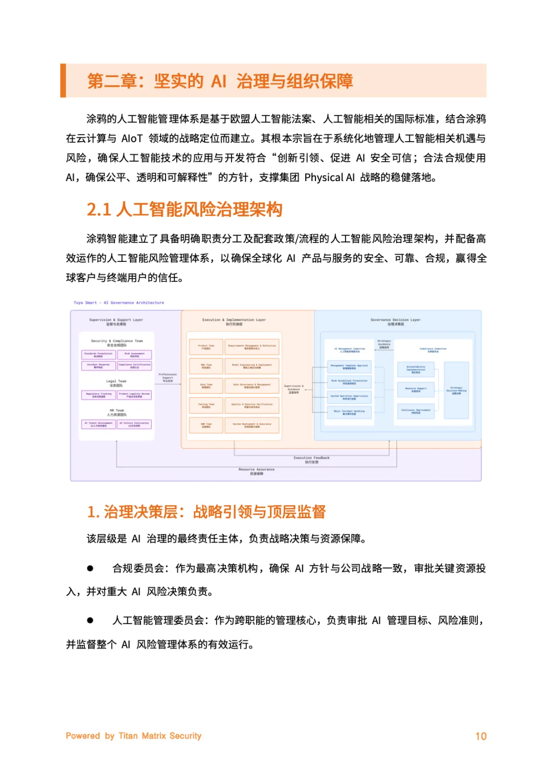 涂鸦智能于2025年12月29日发布《AI安全合规白皮书(V1.0)》,聚焦负责任AI实践,以Titan Matrix一体化智能安全品牌为核心,搭建贯穿AI全生命周期的安全合规体系。依托PREPARE七大核心原则,通过三层治理架构、七大管理制度及全流程安全开发管控,覆盖AI云平台、Hey Tuya家庭助手等三大核心场景,深度契合《人工智能安全治理框架》2.0版“可信应用、防范失控”要求,兼顾全球多地区法规适配,以“可信可控”为基石打造全栈安全基座,助力构建受信赖的智能生态。
