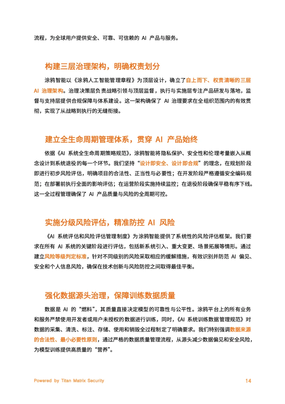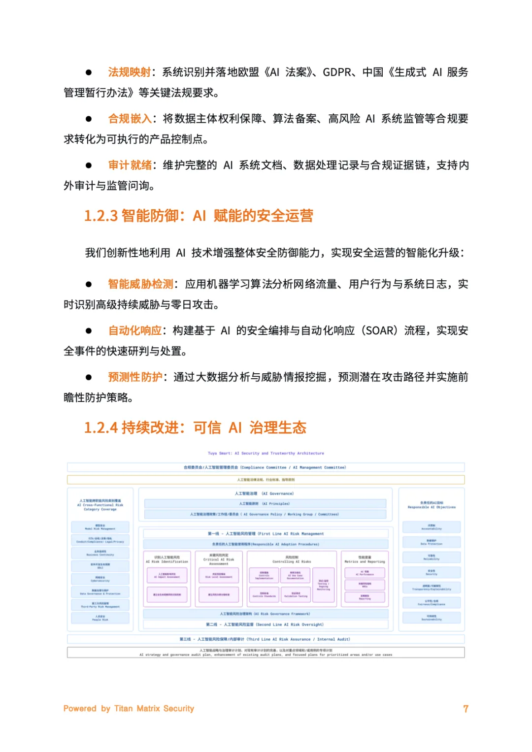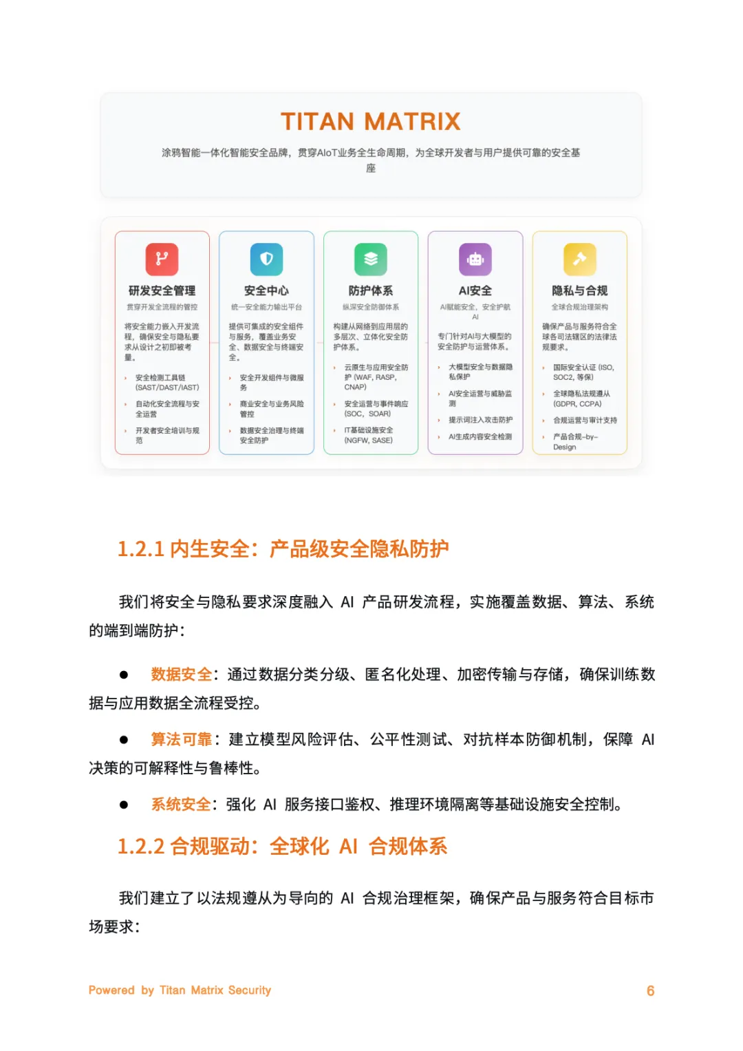 核心是Titan Matrix一体化智能安全品牌,贯穿AloT业务全生命周期。其核心支柱围绕安全与合规落地展开,内生安全将隐私保护融入研发全流程,实现数据、算法、系统的端到端防护。合规驱动锚定全球法规动态,搭建“全球统一基线+地区化适配”体系。智能防御借助AI技术实现威胁检测与预测性防护,持续改进则通过明确责任、定期风险评估强化系统透明度,全方位筑牢安全防线。