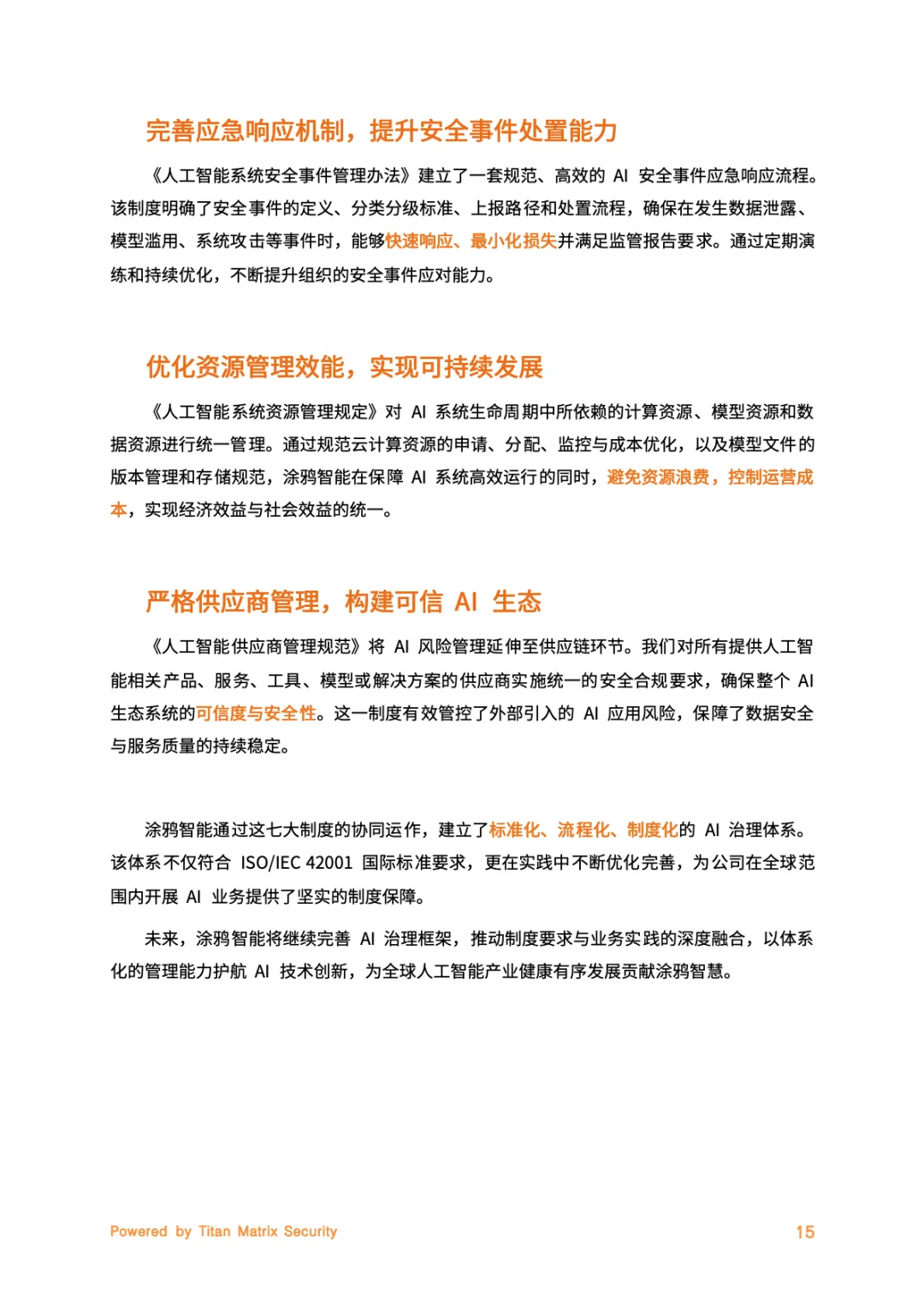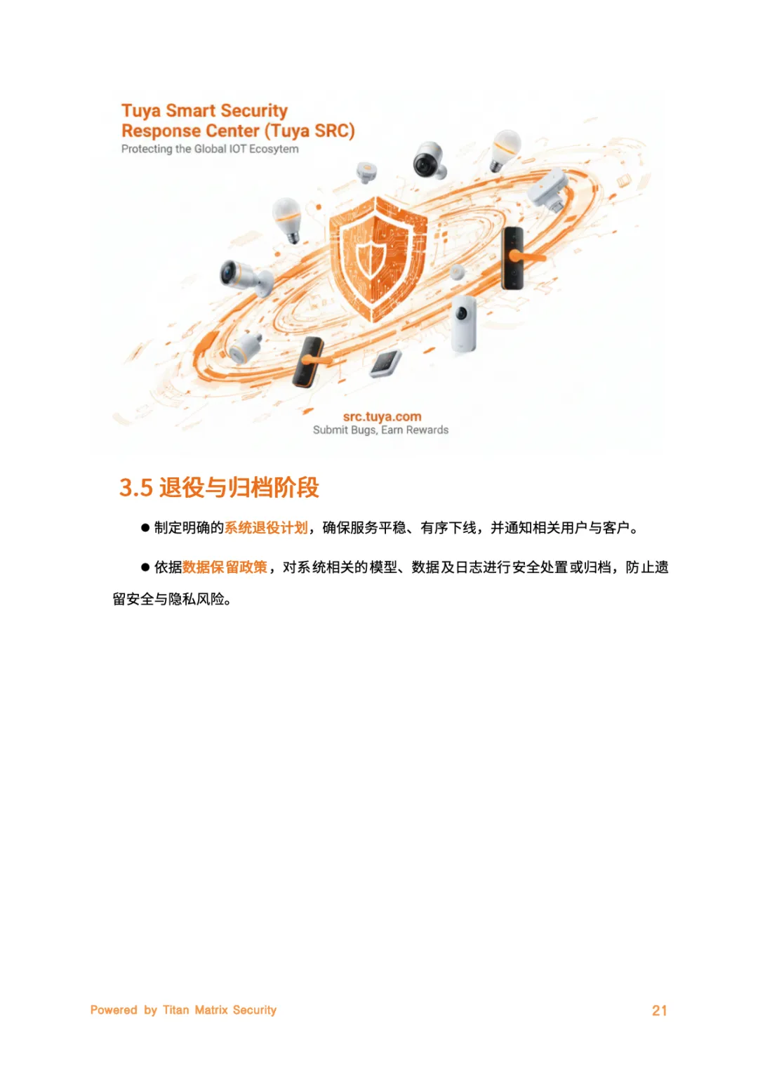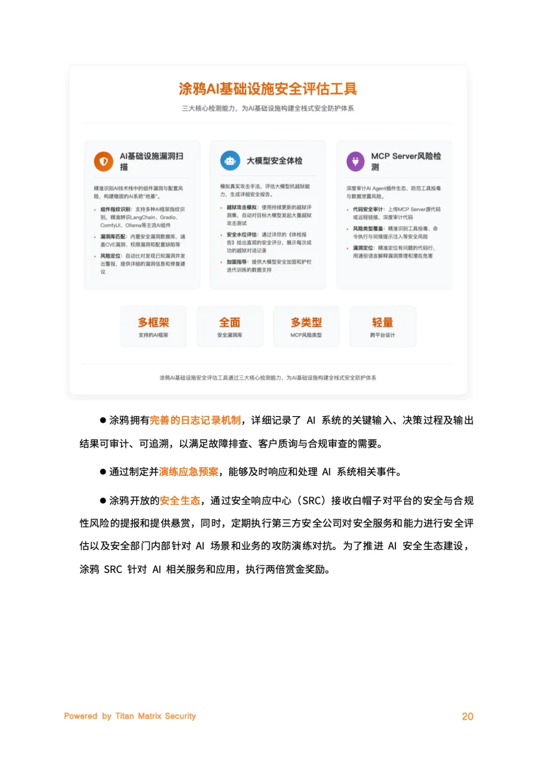 核心是Titan Matrix一体化智能安全品牌,贯穿AloT业务全生命周期。其核心支柱围绕安全与合规落地展开,内生安全将隐私保护融入研发全流程,实现数据、算法、系统的端到端防护。合规驱动锚定全球法规动态,搭建“全球统一基线+地区化适配”体系。智能防御借助AI技术实现威胁检测与预测性防护,持续改进则通过明确责任、定期风险评估强化系统透明度,全方位筑牢安全防线。