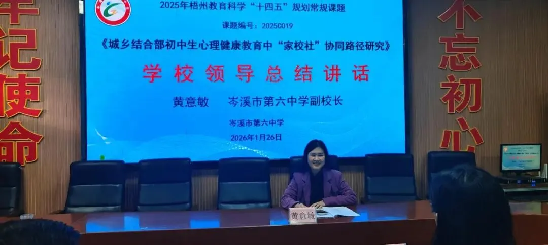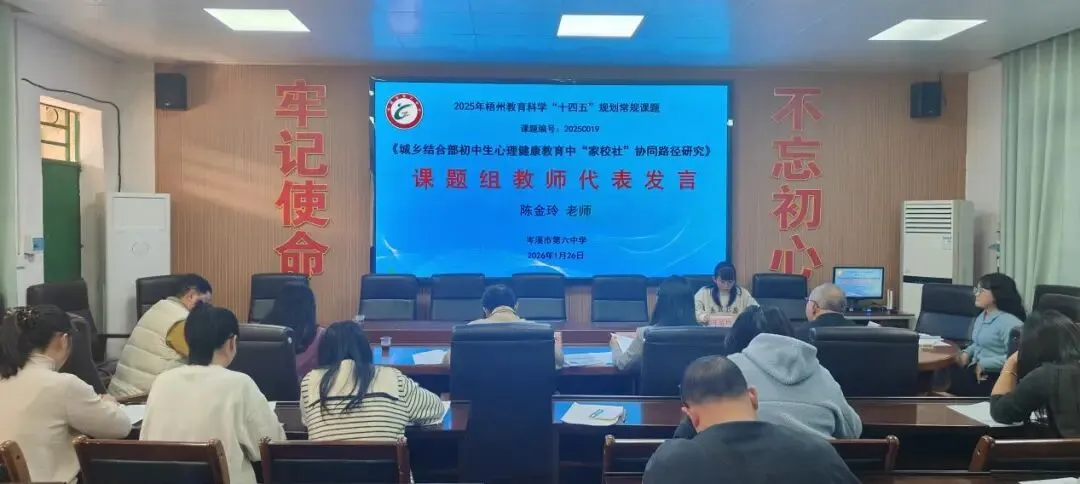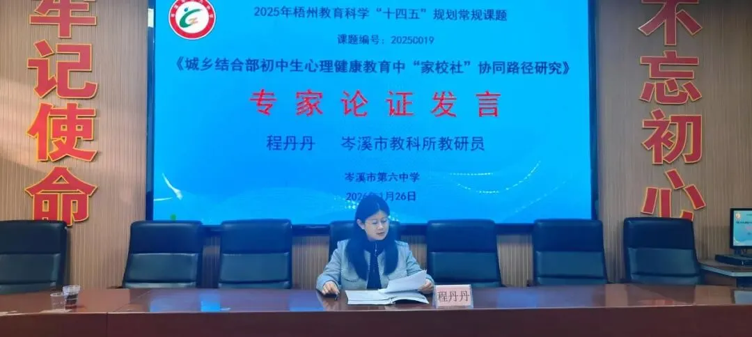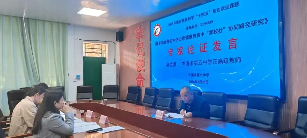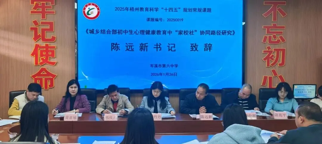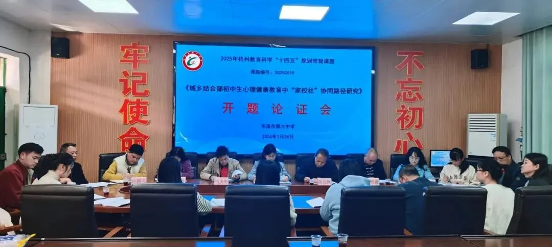 2026年1月26日下午,岑溪市第六中学在党政会议室举行梧州市教育科学“十四五”规划课题《城乡结合部初中生心理健康教育中“家校社”协同路径研究》(编号2025C019)课题开题论证会。市教科所专家、学校领导及课题组全体成员参会。