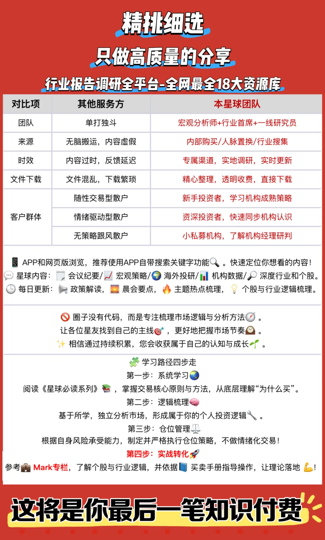 【知识星球】:第一时间分享市场、个股、行业动态,这将构成市场最新的预期差,星球让大家无需自己消耗大量时间,就可以获得最有效、最及时的投研信息。星球已然成为投研资料库,超多投研资料供你随时搜索和【下载】