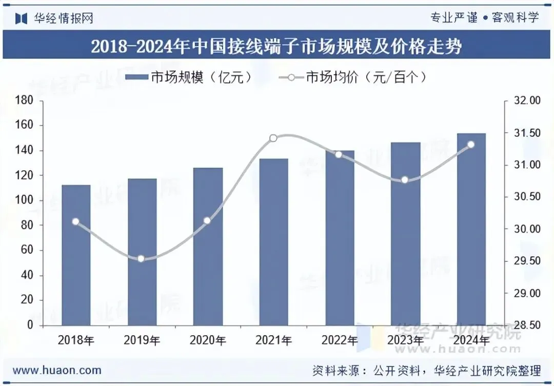 市场规模来看,据统计,截至2024年我国接线端子行业市场规模为154.38亿元,市场均价约为31.13元/百个;未来几年,随着国内企业技术水平得提升,国内出口市场将会不断扩大,随着电子、通信、家电等行业对接线端子需求得增长,国内接线端子行业市场规模还将继续扩大。