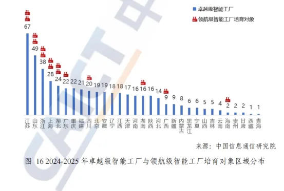 浙江以民营经济为引领,构建显著的梯队建设格局。浙江立足民营经济特色,前瞻布局“未来工厂”体系并持续深化“产业大脑”建设。全省累计建成38个卓越级智能工厂,标志着浙江在智能制造体系建设上已进入系统化、规模化推进阶段。浙江智能制造顶层设计起步较早,通过构建以“产业大脑”为核心、以“未来工厂”为引领的智能制造新实践,实现从国家战略到地方实践的同频共振与无缝衔接,为智能工厂的培育和升级提供清晰的路径与有力支撑。