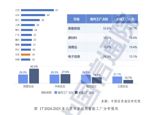 在企业主体层面,呈现出显著的多元共建特征,中型企业表现突出,其占比高于全国9个百分点,彰显了高成长性企业在创新链条中的关键活力;更重要的是,民营企业、央企、地方国企及三资企业占比均在20%以上,形成了不同所有制主体均衡参与、功能互补、协同共进的良性生态。这充分表明,北京通过有效的政策引导与市场机制,成功激发了央企的技术引领力、民营企业的创新敏捷性以及外资企业的全球资源网络,共同构筑了符合首都功能定位的、以高端化为导向、以多元主体协同为根本支撑的智能制造发展路径。