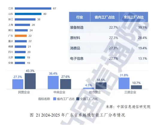 广东智能工厂建设呈现显著的外向型经济特征。作为改革开放前沿与制造强省,广东省智能制造建设格局依托独特发展路径,全省累计建成22家卓越级智能工厂。
