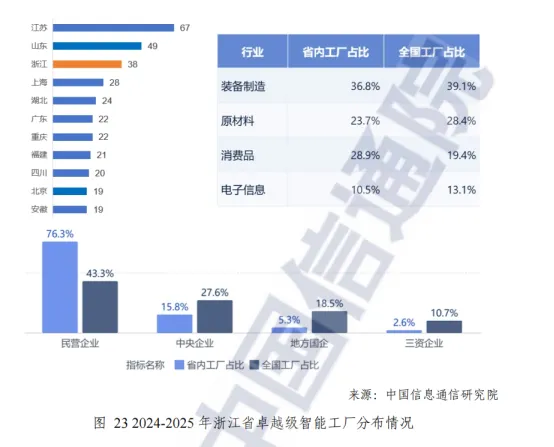 从行业分布看,消费品行业的智能工厂占比显著领先全国平均水平,这充分依托于其在家电、纺织服装等传统优势产业集群中积累的深厚基础,并通过智能化改造实现优势产业的能级跃升;装备制造业则与全国平均水平持平,而原材料与电子信息领域尚有提升空间,反映浙江智能制造的推进路径与现有产业结构和比较优势紧密结合。