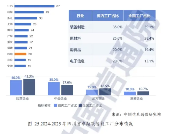 从产业结构来看,电子信息行业智能工厂占比显著高于全国水平,凸显出四川在全球电子信息 产业分工中形成的集群优势和技术积累;装备制造业虽整体占比略低于全国,但在电气机械、航空航天等高端领域仍保持扎实的产业基础,体现了制造业体系的广度与韧性。
