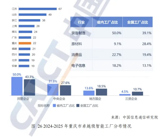 重庆智能制造以装备制造业为引擎,大型民央企双轮驱动,建设成效快速提升。重庆市在推进智能制造进程中展现出快速提升的发展态势,全市累计建成22家卓越级智能工厂并在2024至2025年间实现从7家到15家的显著增长,这一发展格局深度契合重庆作为全国重要制造业基地的战略定位。