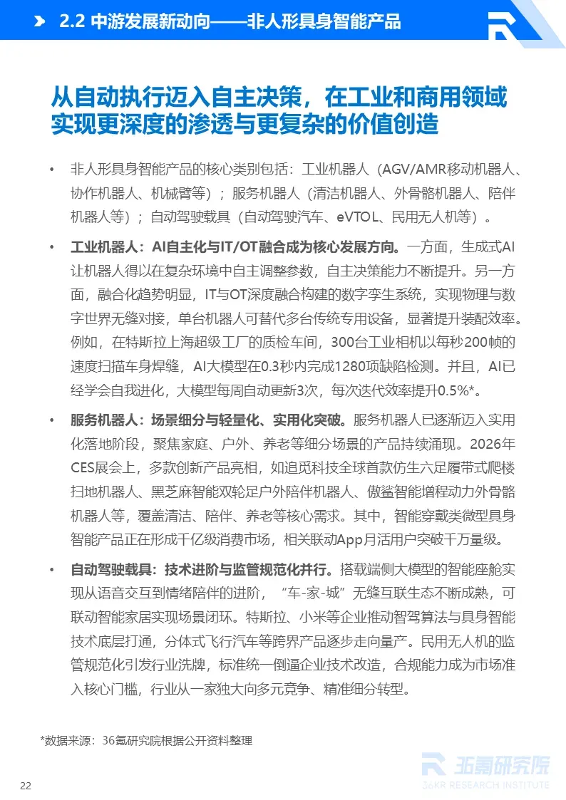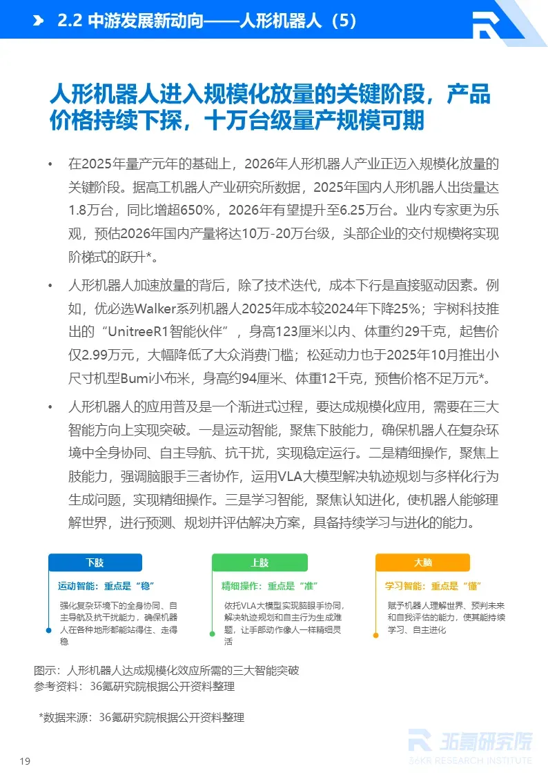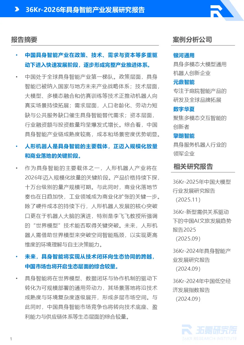 更多精彩内容,请关注“36氪研究院”微信公众号。如想获取《2026年具身智能产业发展研究报告》,点击文章底部阅读原文,提取码:826n,或在36氪研究院微信公众号上回复“具身智能2026”获取下载链接。