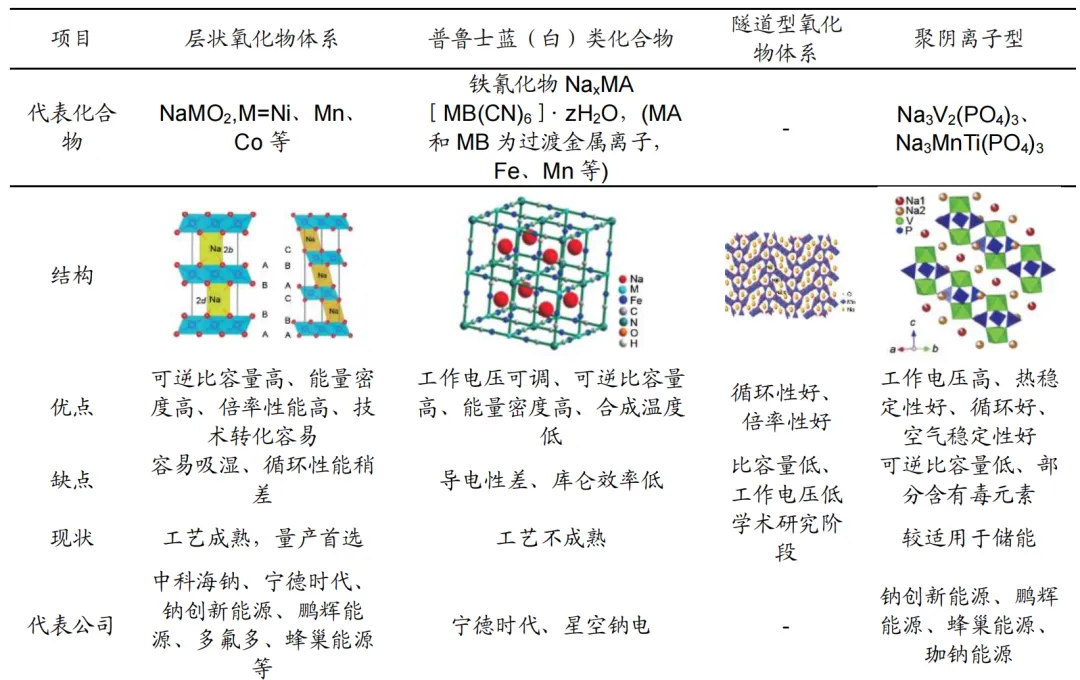 层状氧化物:是主流,结构结构像多层蛋糕,层间距大,钠离子能在中间穿梭,类似于锂电池的三元材料,综合性能最佳,能量密度最高,同时具有优异的倍率性能,稳定性稍差,但无明显短板,适合要求较高的动力电池领域。且工艺与锂电三元相似,可沿用其生产设备,技术简单,有望率先规模投产。