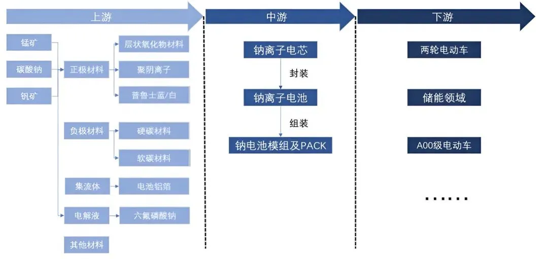 钠离子电池产业链也主要分为上游的电池材料、中游的电芯、电池制作,以及下游的储能、低速车、A00 级新能源车领域。