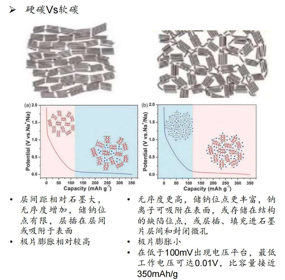 用于生产硬碳的主要为生物质、树脂类和高分子类前驱体;制备软碳材料的前驱体主要包括石油化工原料及其下游产品,如煤、沥青、石油焦等,但是直接碳化的软碳材料在钠离子电池中表现出较低的可逆容量。