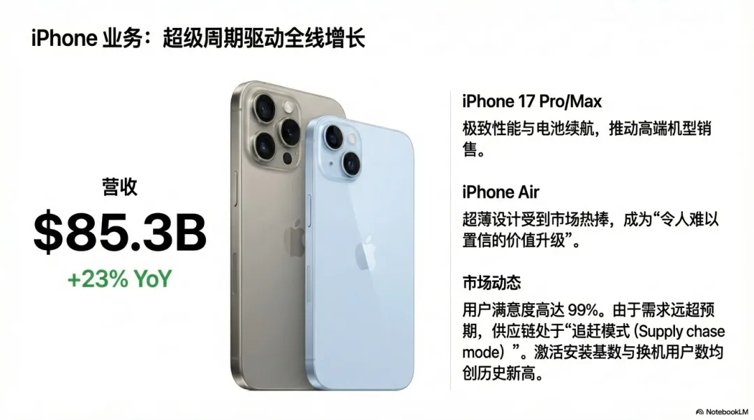 把1438亿美元拆开看,最核心的增长引擎毫不意外:iPhone。iPhone收入853亿美元,同比+23%!