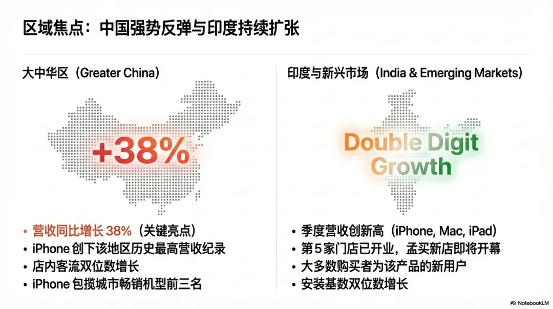 但更反直觉的是:iPhone不仅卖得好,还在一个大家以为它“越来越难”的地方卖得特别好——大中华区同比+38%。
