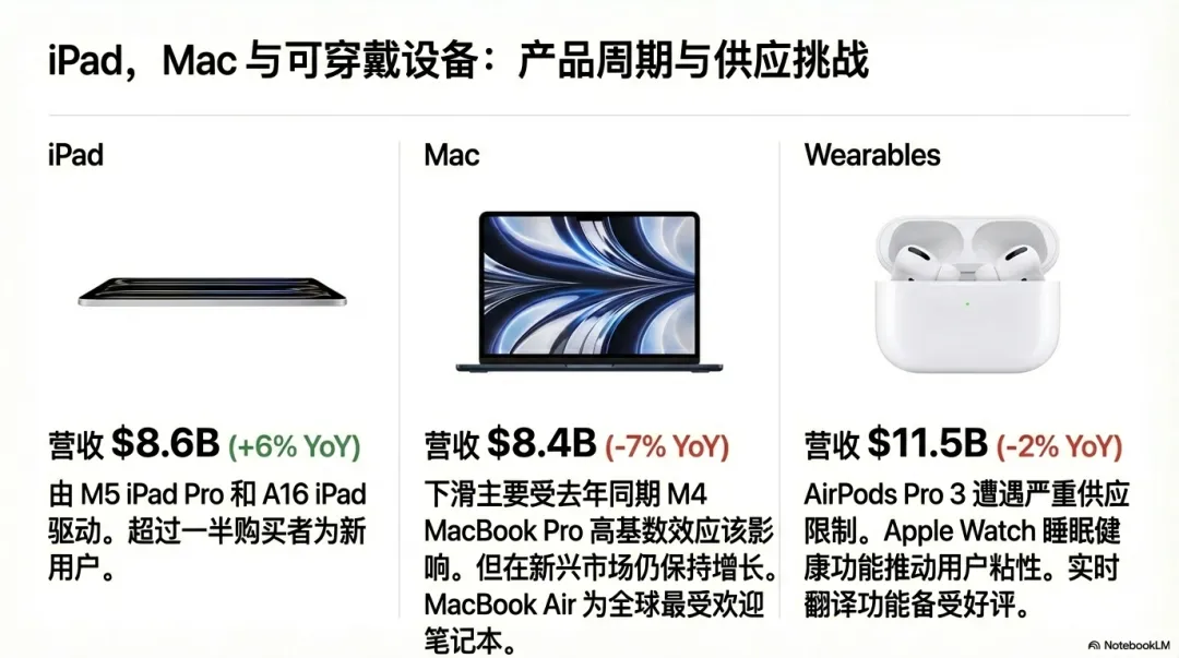 ·Mac下滑:高基数效应,去年同期新品发布极其成功,把比较基准抬得异常高。(M4 的Mac太香了,我都买了。)