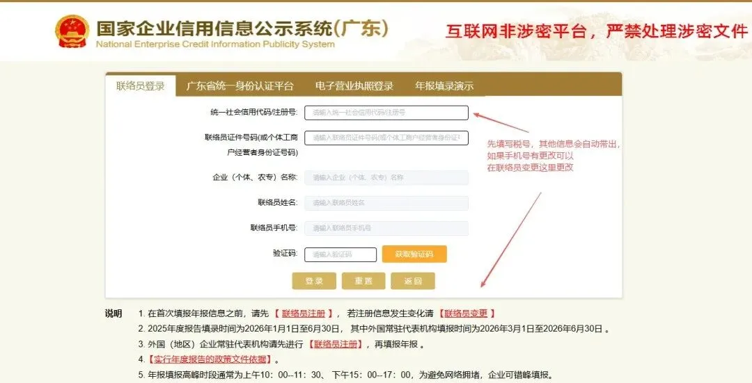 登录后点击“年度报告填写”,选择“2025年度”,阅读填报须知并勾选“已阅”确认;