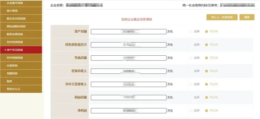按系统引导填写企业基本信息、股东及出资信息、资产状况、社保信息等,无相关信息填“无”或“0”,确保数据真实准确;