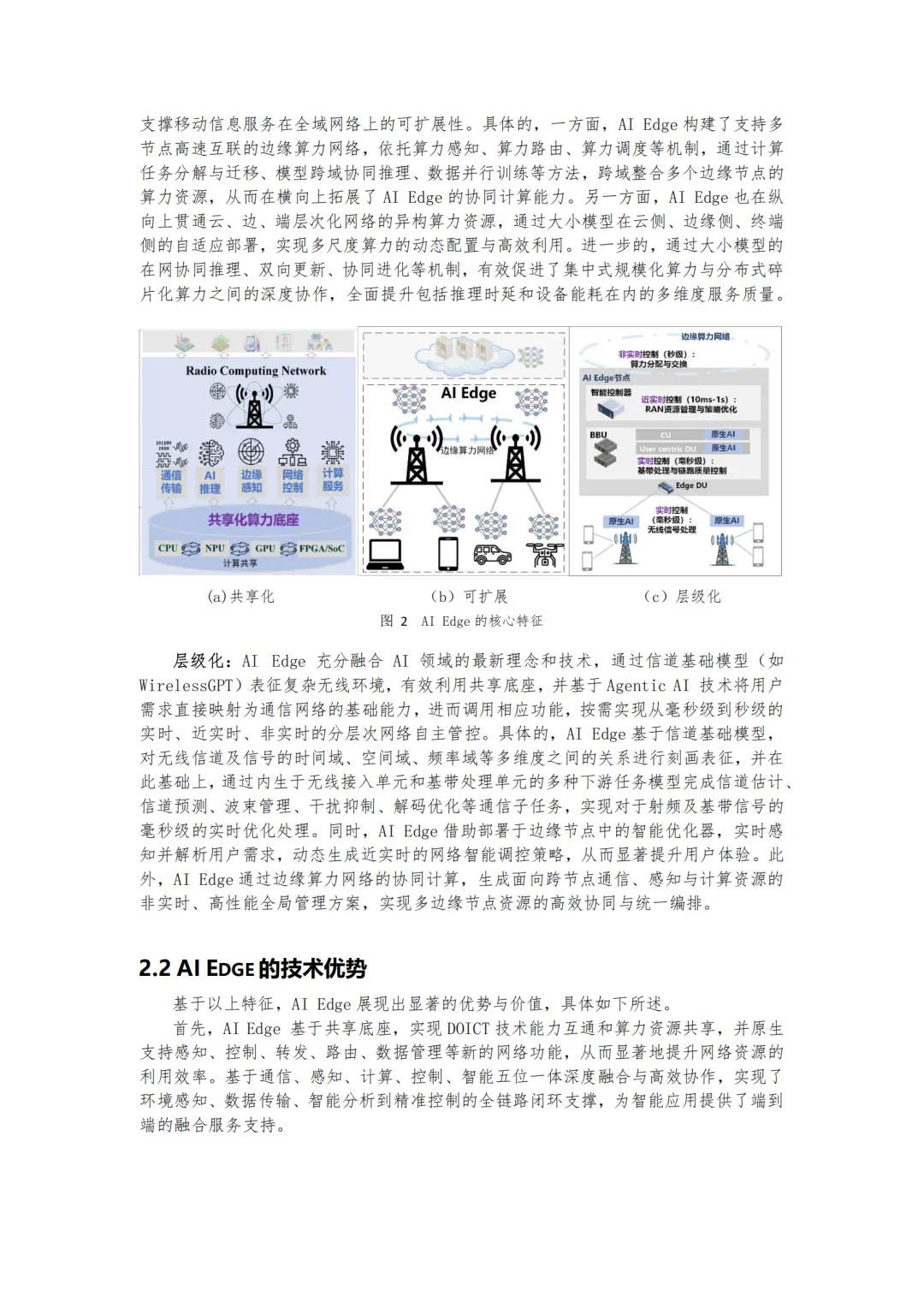 全球范围内,ITU-R 6G “通智融合” 愿景引领方向,产业界如 AI-RAN 联盟、Next G Alliance 等积极推进技术研发,学术界在电信基础大模型、AI 辅助物理层设计等领域成果丰硕,共同推动 AI Edge 发展。其核心特征体现为共享化、可扩展、层级化,通过异构算力整合、跨域协同调度与分层次自主管控,实现资源高效利用与服务灵活扩展。