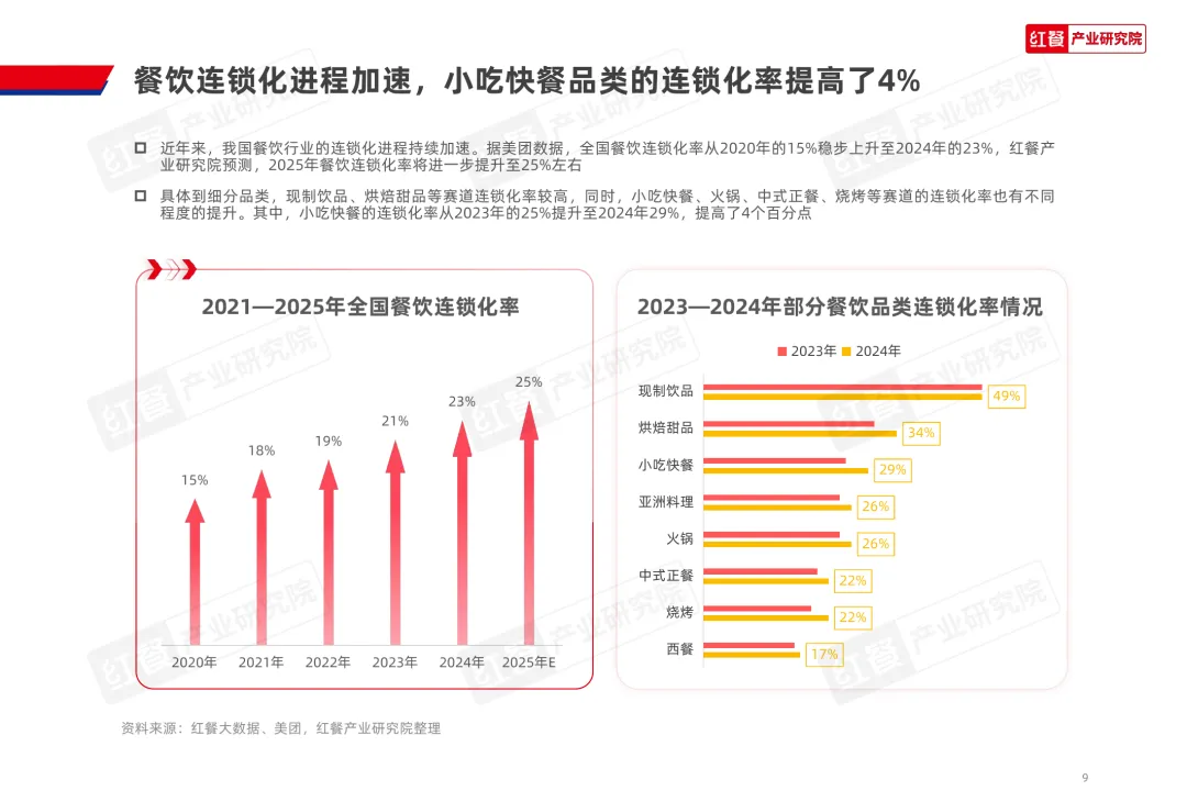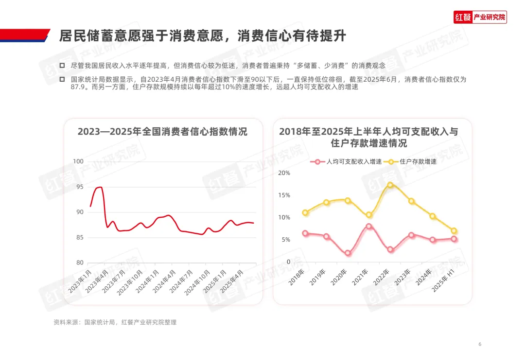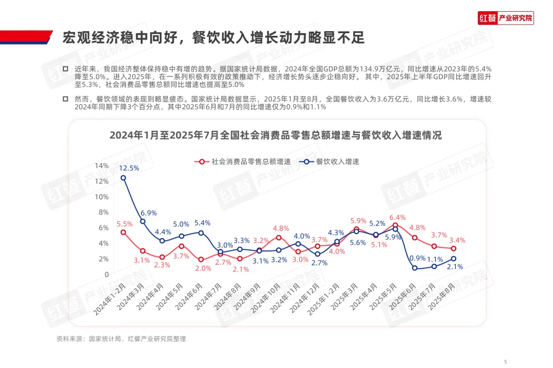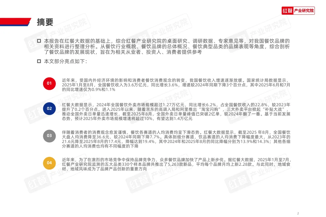 中国餐饮品牌力白皮书2025指出,2025年1月至8月全国餐饮收入为3.6万亿元,同比增长3.6%,增速较2024年同期下降3个百分点。其中,6月和7月同比增速仅为0.9%和1.1%。与此外卖市场持续扩张,2024年全国餐饮外卖市场规模超过1.27万亿元,占全国餐饮收入的22.8%。进入2025年后,三大平台通过补贴大战推动外卖日单量迅速增长,截至8月峰值突破2亿单,预计2025年外卖市场规模增速将超10%,有望达到1.4万亿元。消费者消费观念趋于谨慎,导致各细分赛道人均消费普遍下滑。截至2025年8月,全国餐饮大盘人均消费降至36.6元,较2024年同期下降7.7%。饮品赛道降幅最大,从2023年的21.6元降至17.4元,降幅达19.4%。其他细分赛道也均出现不同程度下降。为应对市场竞争,餐饮品牌加快产品上新速度。2025年1月至7月,红餐产业研究院监测的五大品类330个样本品牌共推出5,263款新品,平均每月上新2.28款。地域食材与风味成为产品创新的重要方向。行业整体呈现增速放缓趋势,但外卖市场扩张显著。在竞争加剧背景下,品牌更注重产品创新与本地化特色。健康、可持续的餐饮生态逐渐成为行业共识,消费者对“餐饮定义”的话语权日益增强。