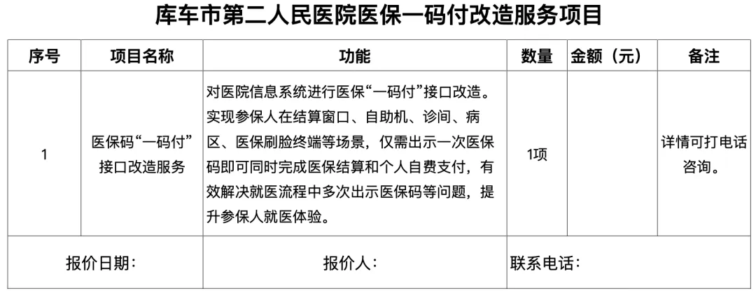 市场调研反馈意见及材料递交方式:1.线下获取,潜在供应商将调研反馈纸质版材料(加盖公章)密封送达库车市第二人民医院运营管理办;2.线上获取,潜在供应商将纸质版材料(加盖公章)扫描后以PDF扫描件格式发送至电子邮箱kceyy74@163.com。邮件主题注明“xxx项目xxx公司(公司名称)”将公司有效的营业执照、报价单(必填:报价日期、报价人、联系电话)一并通过邮箱发送。