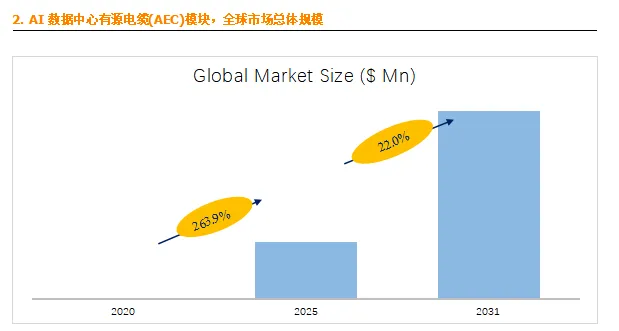 据最新市场调研报告显示,预计到2031年,全球AI数据中心有源电缆(AEC)模块市场规模将达到26.6亿美元,未来几年的年复合增长率(CAGR)预计为22.0%。这一增长主要得益于AI服务器、高速以太网(400G/800G)及云数据中心建设的加速推进。