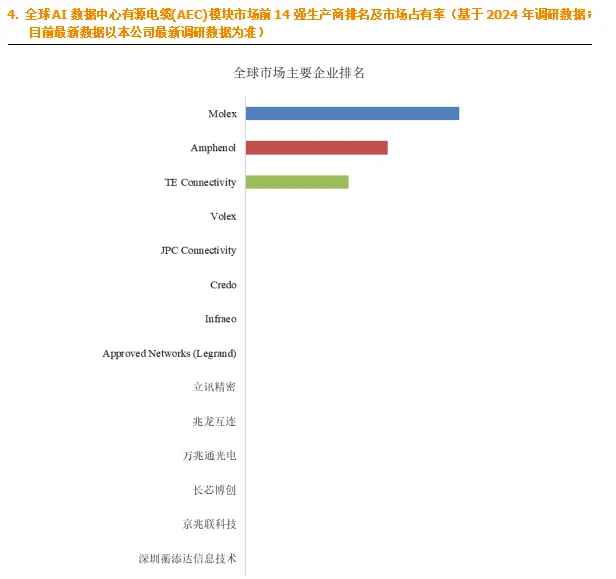 全球范围内,AI数据中心有源电缆(AEC)模块主要生产商包括Molex,Amphenol,TE Connectivity等,其中前五大厂商占有大约62.4%的市场份额。