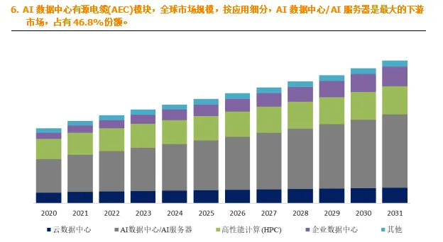 应用领域拓展:AI数据中心/AI服务器是AEC模块最大的下游市场,占据大约46.8%的份额。随着AI推理工作负载在云数据中心和边缘数据中心的快速增长,对低时延、低功耗互连方案的需求将进一步提升,AEC模块有望在更广泛的AI和高性能计算场景中实现规模化应用。