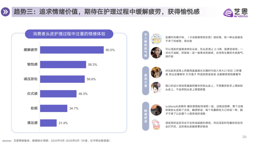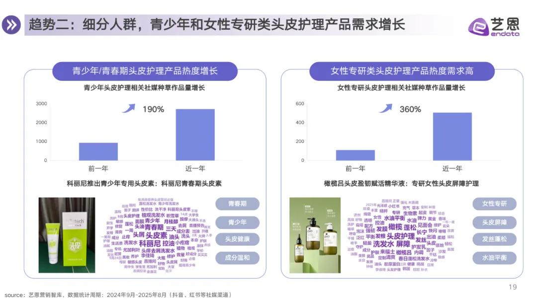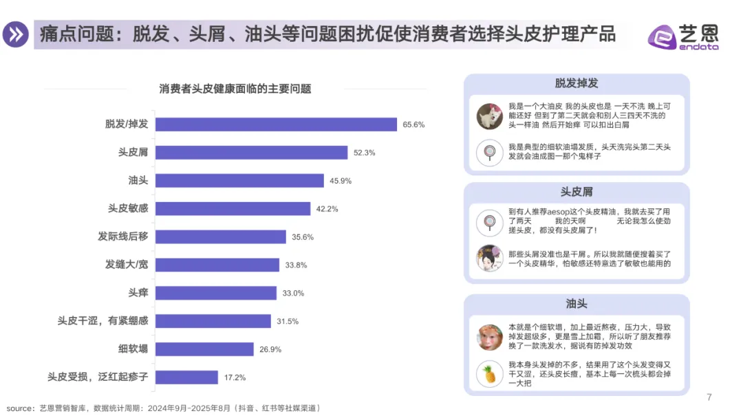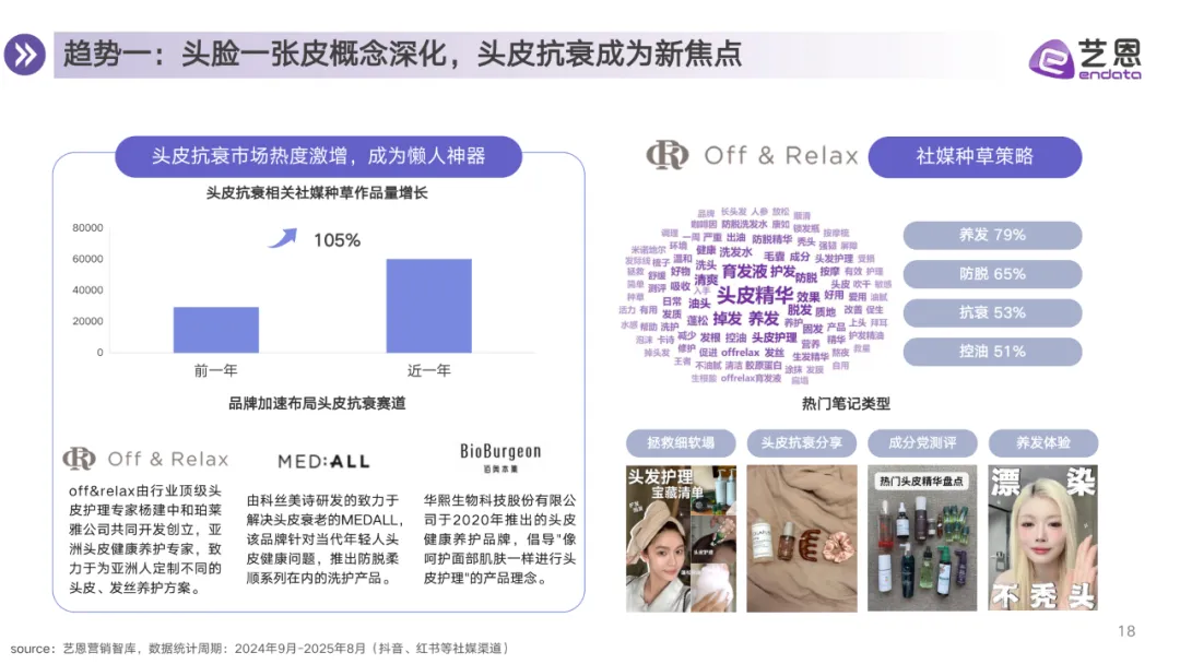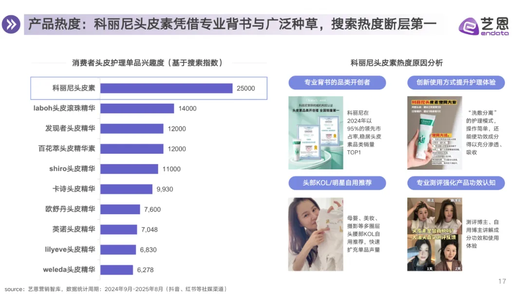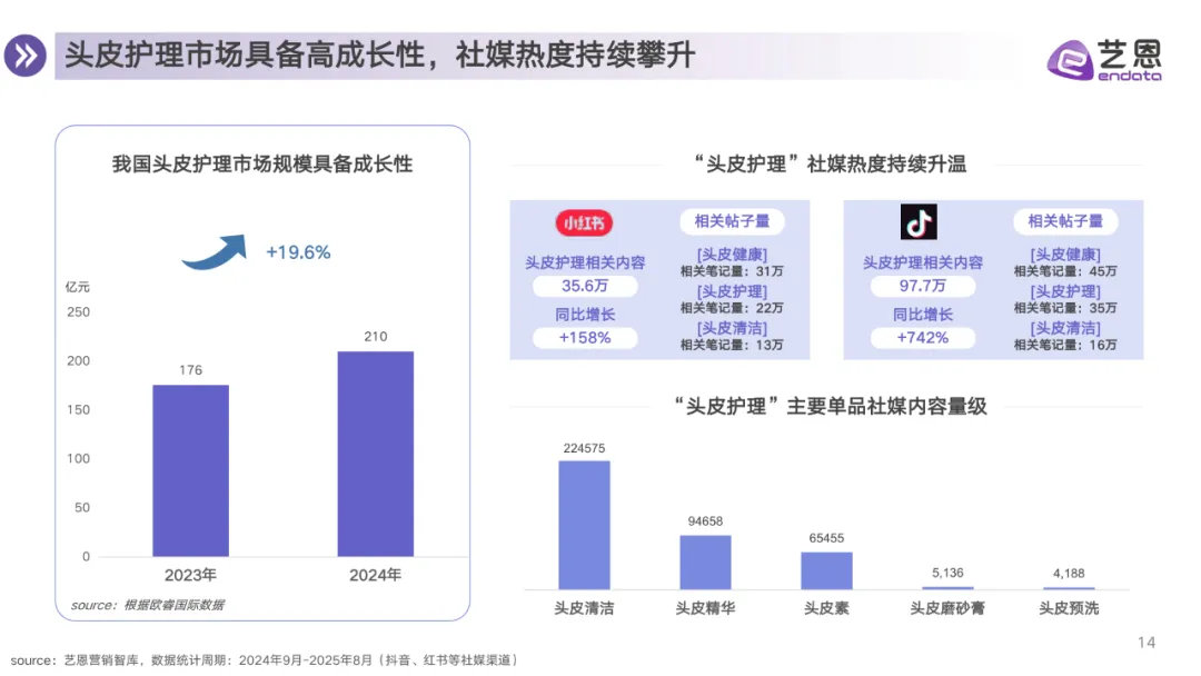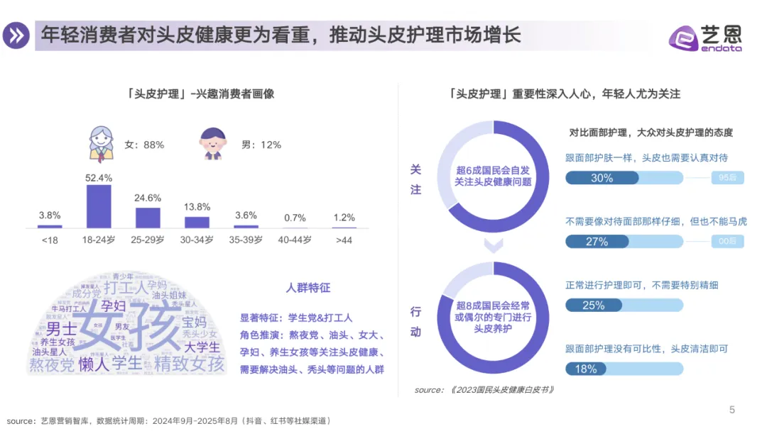 导读:报告结合社媒数据与消费者调研,从人群特征、市场趋势、社媒营销维度,剖析头皮护理行业动态,为品牌布局提供参考。报告先呈现消费者核心特征。超 6 成国民自发关注头皮健康,95 后、00 后等年轻群体关注度最高,女性占比 88%。消费者头皮问题以脱发(65.6%)、头屑(52.3%)、油头(45.9%)为主,选购时优先关注产品功效(73.3%)、成分(66.8%)与使用体验(56.9%)。86.8% 消费者期待天然植物成分,氨基酸、咖啡因、侧柏叶等成主流偏好,使用场景以日常(74.1%)与工作(67.6%)为主,追求控油止痒、清爽蓬松体验。核心内容解析市场趋势与竞争格局。2024 年头皮护理市场规模达 176 亿元,社媒热度同比增 158%,头皮抗衰、女性专研、情绪价值成新兴趋势。国际品牌主导市场,国产品牌科丽尼凭借青蒿成分与专业背书突围,其头皮素搜索热度断层第一。产品创新聚焦细分人群,如青少年专用款、女性屏障护理款,同时注重情绪体验,80.5% 消费者希望护理过程缓解疲劳。
