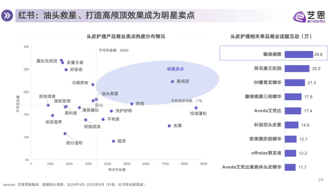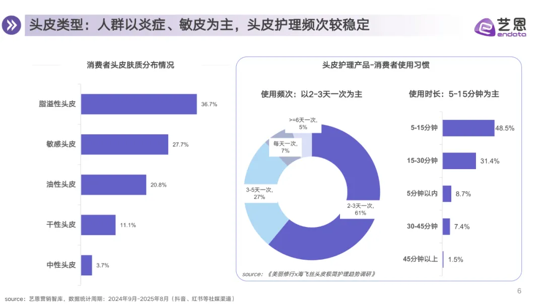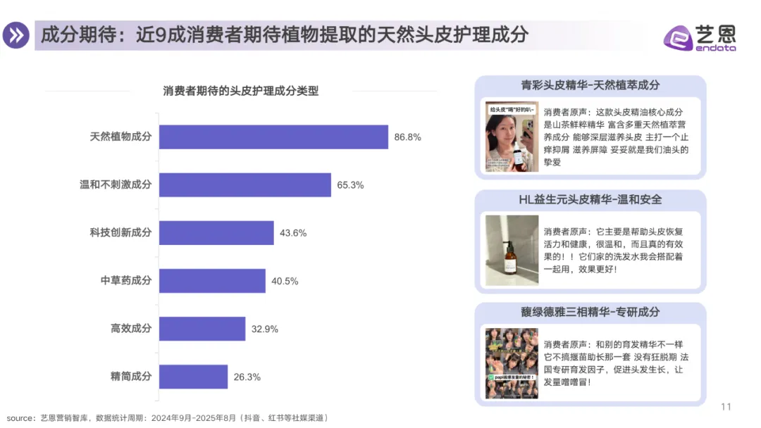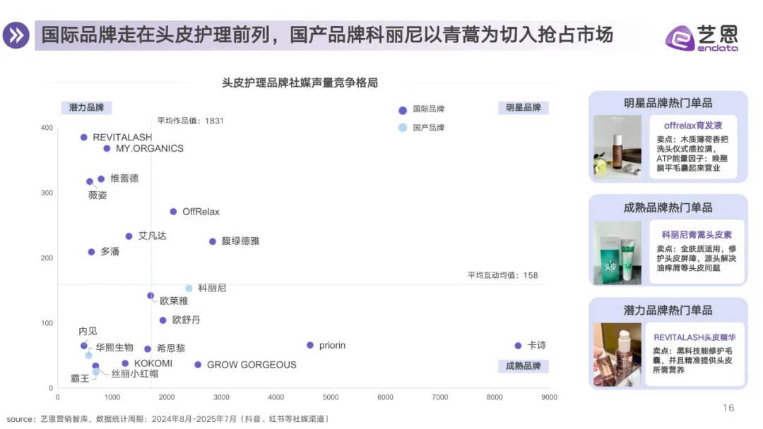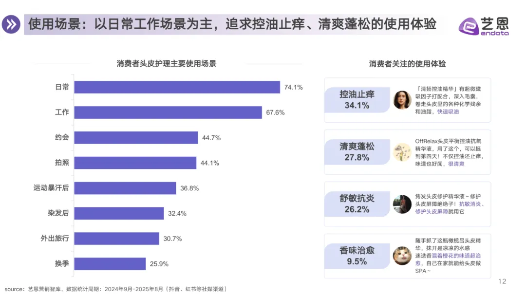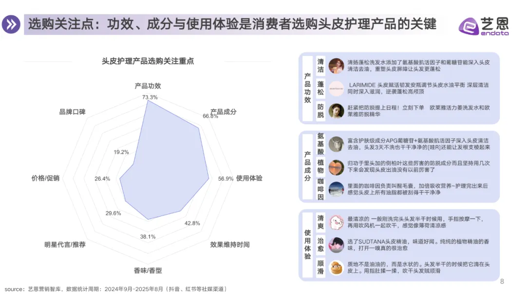 导读:报告结合社媒数据与消费者调研,从人群特征、市场趋势、社媒营销维度,剖析头皮护理行业动态,为品牌布局提供参考。报告先呈现消费者核心特征。超 6 成国民自发关注头皮健康,95 后、00 后等年轻群体关注度最高,女性占比 88%。消费者头皮问题以脱发(65.6%)、头屑(52.3%)、油头(45.9%)为主,选购时优先关注产品功效(73.3%)、成分(66.8%)与使用体验(56.9%)。86.8% 消费者期待天然植物成分,氨基酸、咖啡因、侧柏叶等成主流偏好,使用场景以日常(74.1%)与工作(67.6%)为主,追求控油止痒、清爽蓬松体验。核心内容解析市场趋势与竞争格局。2024 年头皮护理市场规模达 176 亿元,社媒热度同比增 158%,头皮抗衰、女性专研、情绪价值成新兴趋势。国际品牌主导市场,国产品牌科丽尼凭借青蒿成分与专业背书突围,其头皮素搜索热度断层第一。产品创新聚焦细分人群,如青少年专用款、女性屏障护理款,同时注重情绪体验,80.5% 消费者希望护理过程缓解疲劳。