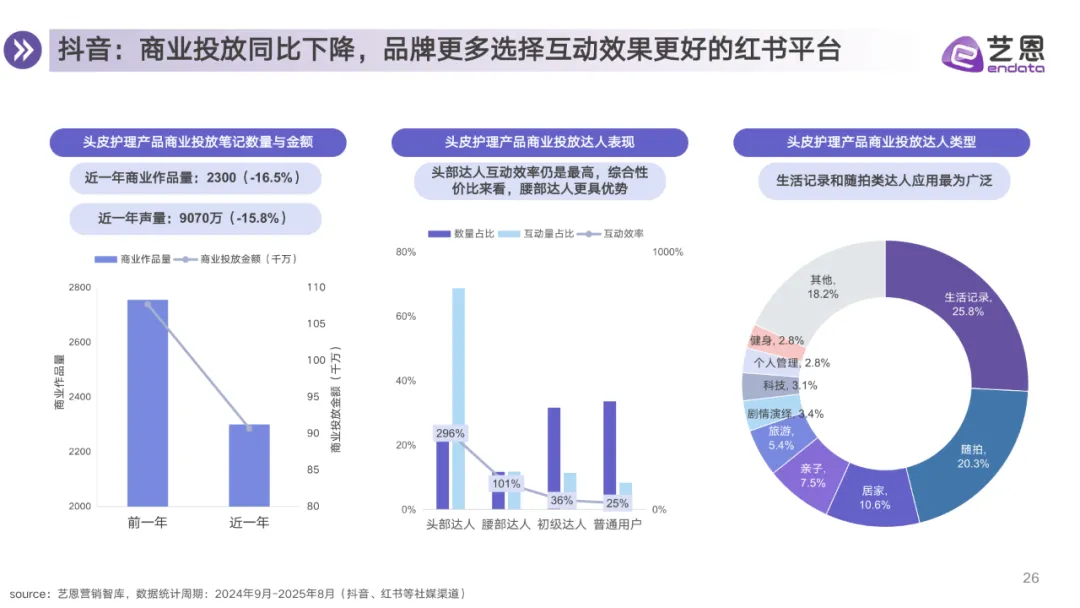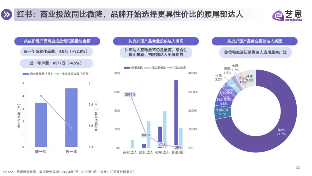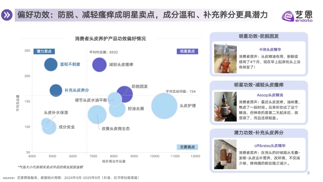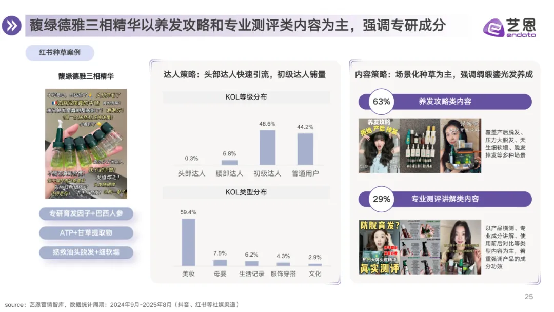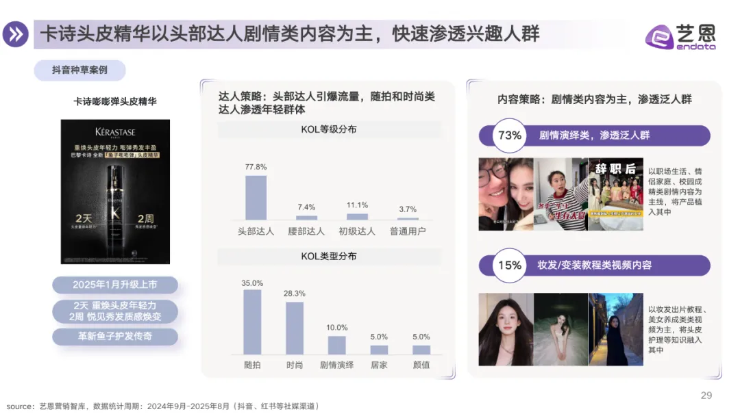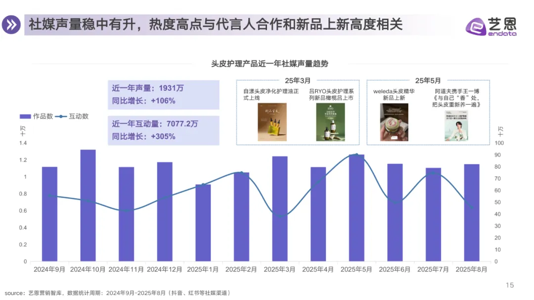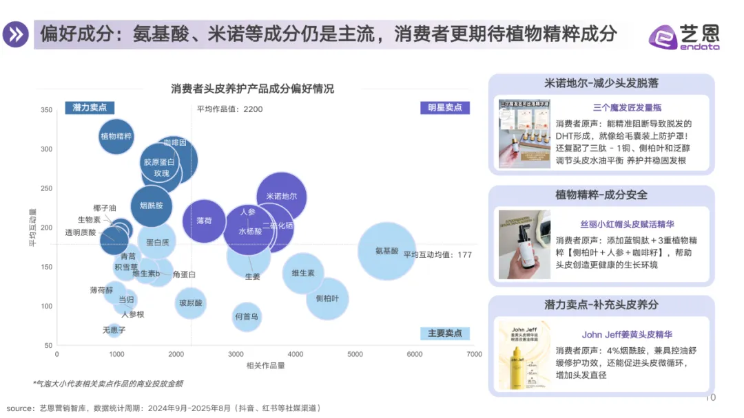 导读:报告结合社媒数据与消费者调研,从人群特征、市场趋势、社媒营销维度,剖析头皮护理行业动态,为品牌布局提供参考。报告先呈现消费者核心特征。超 6 成国民自发关注头皮健康,95 后、00 后等年轻群体关注度最高,女性占比 88%。消费者头皮问题以脱发(65.6%)、头屑(52.3%)、油头(45.9%)为主,选购时优先关注产品功效(73.3%)、成分(66.8%)与使用体验(56.9%)。86.8% 消费者期待天然植物成分,氨基酸、咖啡因、侧柏叶等成主流偏好,使用场景以日常(74.1%)与工作(67.6%)为主,追求控油止痒、清爽蓬松体验。核心内容解析市场趋势与竞争格局。2024 年头皮护理市场规模达 176 亿元,社媒热度同比增 158%,头皮抗衰、女性专研、情绪价值成新兴趋势。国际品牌主导市场,国产品牌科丽尼凭借青蒿成分与专业背书突围,其头皮素搜索热度断层第一。产品创新聚焦细分人群,如青少年专用款、女性屏障护理款,同时注重情绪体验,80.5% 消费者希望护理过程缓解疲劳。