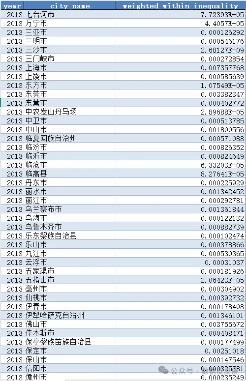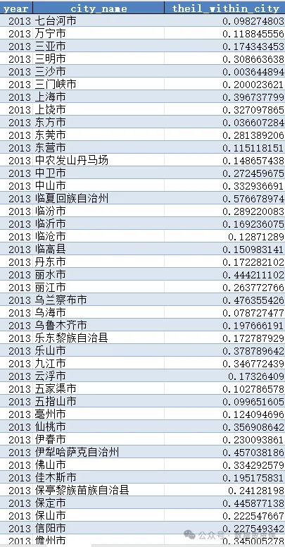 本数据参考郭立祥等人发表在统计研究上的文章,基于NOAA发布的VIIRS 夜间灯光遥感数据,按照中国县级行政区划对夜间灯光栅格数据进行空间统计,计算得到各县年度夜间灯光总量。随后将县级单元匹配至对应的地级市,以县域夜间灯光总量表征经济规模,采用泰尔指数测度城市内部不同县域之间的经济差距,并根据城市夜间灯光总量对城市内部经济差距进行加权处理,构建得出城市内经济差距指标。