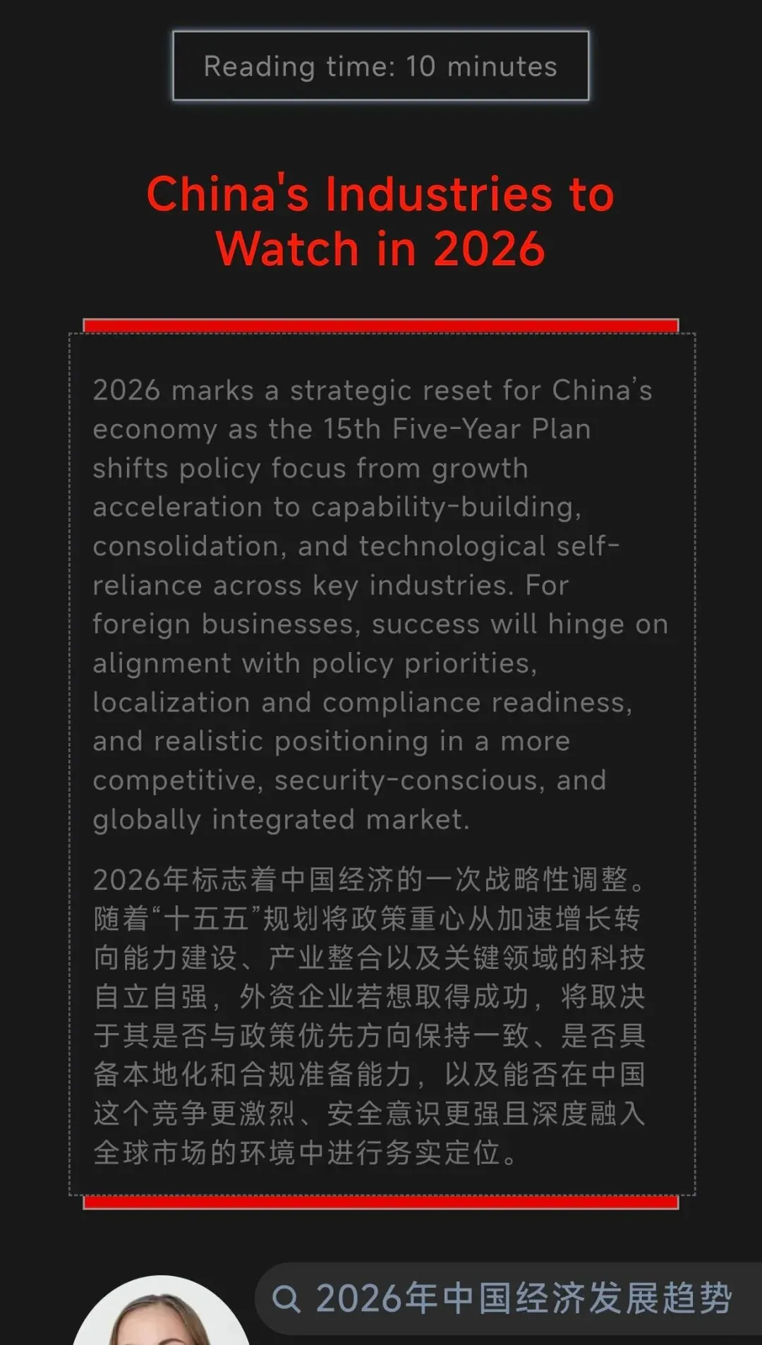 碳达峰、碳中和目标推动能源结构转型,新能源、节能环保产业将持续增长,传统高耗能行业面临转型升级压力。总体而言,2026年中国经济发展将更加注重质量、创新和可持续性,产业结构优化、内需扩大和科技自立将成为核心驱动力。