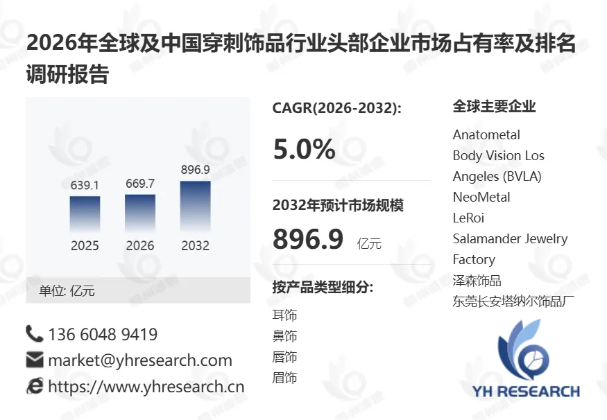 据恒州诚思调研统计,2025年全球穿刺饰品市场规模约639.1亿元,预计未来将持续保持平稳增长的态势,到2032年市场规模将接近897.1亿元,未来六年CAGR为5.0%。
