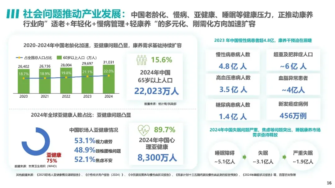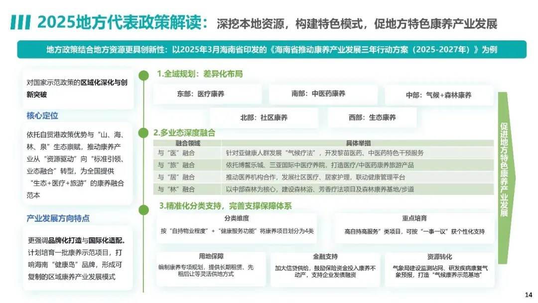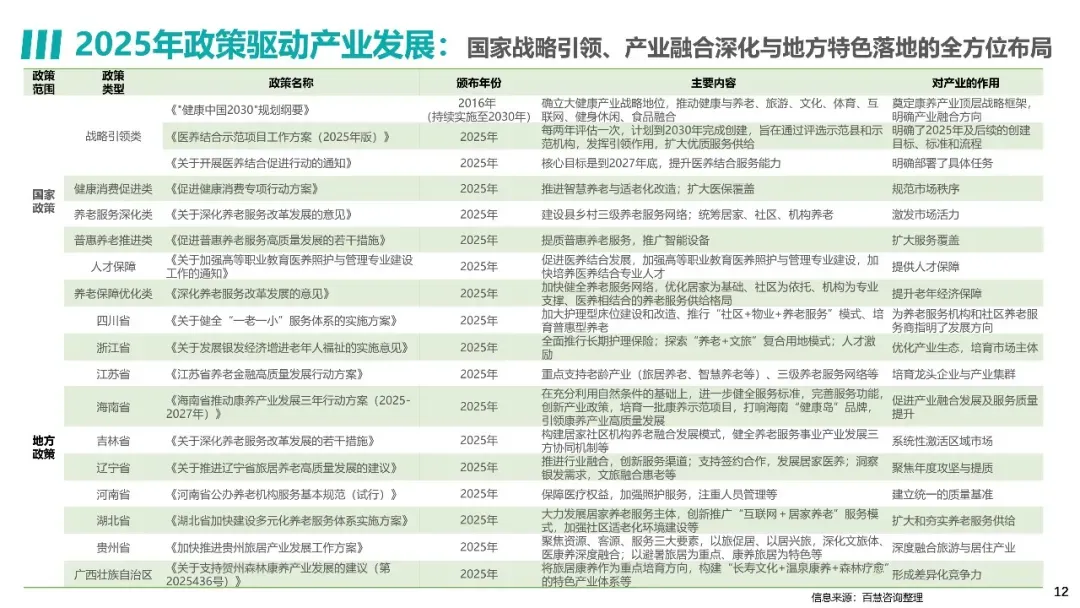 政策与经济的双重驱动为产业保驾护航。国家层面,“健康中国2030”规划纲要持续引领,医养结合促进行动、普惠养老服务等政策精准发力;地方层面,海南、浙江、四川等省份结合本地资源,推出各具特色的发展方案,海南“健康岛”、贵州旅居康养等品牌逐步成型。