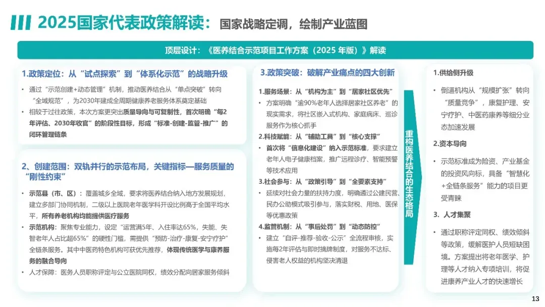 一是顶层设计落地,《医养结合示范项目工作方案(2025年版)》明确示范标准和实施路径,标志着医养结合从理念倡导进入规模化发展阶段;