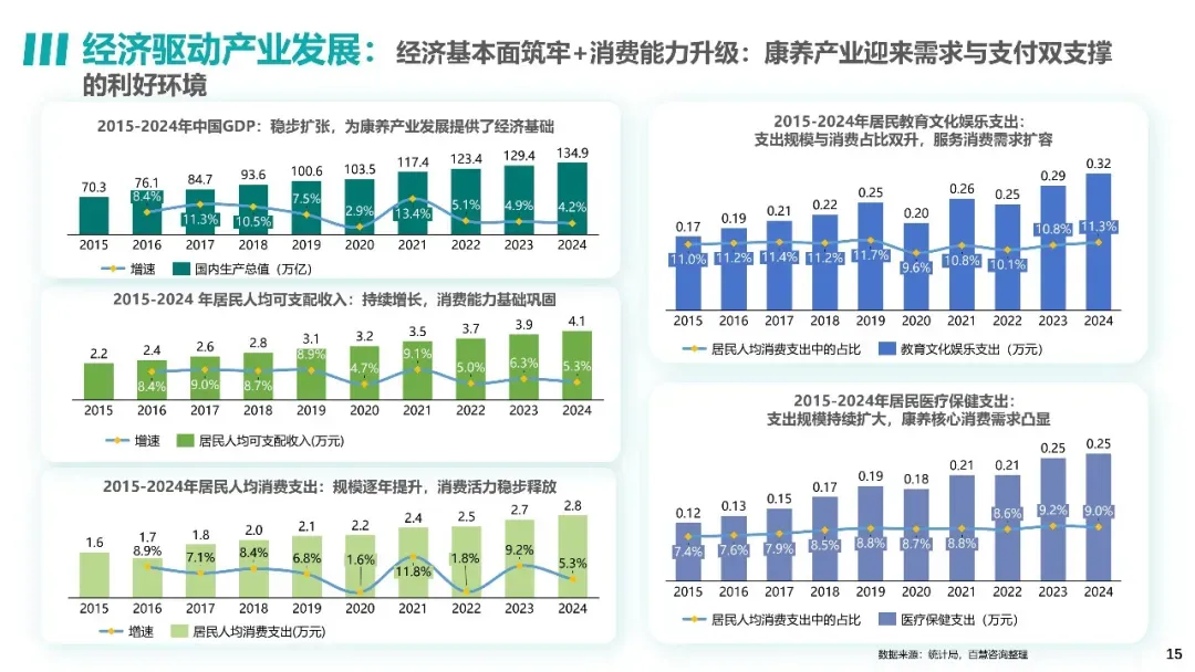 经济层面,2015-2024年居民人均可支配收入从2.2万元增至4.1万元,医疗保健支出持续扩大,为康养消费提供了坚实的支付基础。