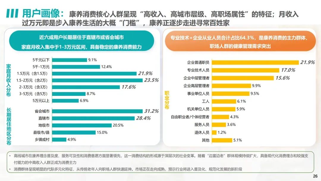 康养消费不再是老年人的专属,全龄化、家庭化趋势日益凸显。报告显示,康养核心用户集中于高线城市,近六成用户长期居住在直辖市或省会城市,家庭月收入以1-3万元为主,具备稳定的消费能力。职业分布上,企业普通职员、专业技术人员、企业管理者合计占比64.3%,职场人群成为康养消费的主力群体。