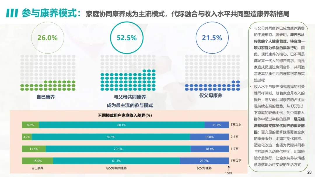 家庭协同康养成为最主流的参与模式,占比达52.5%,远超个人康养(26.0%)和仅父母康养(21.5%)。随着家庭收入提升,共同康养的比例持续走高,3万元以上月收入家庭中,与父母共同康养的占比高达80.1%。这意味着康养已从个人健康管理升级为家庭品质生活的重要组成部分,定制化体检、适老化改造、短途疗愈旅行等全家共养项目备受青睐。