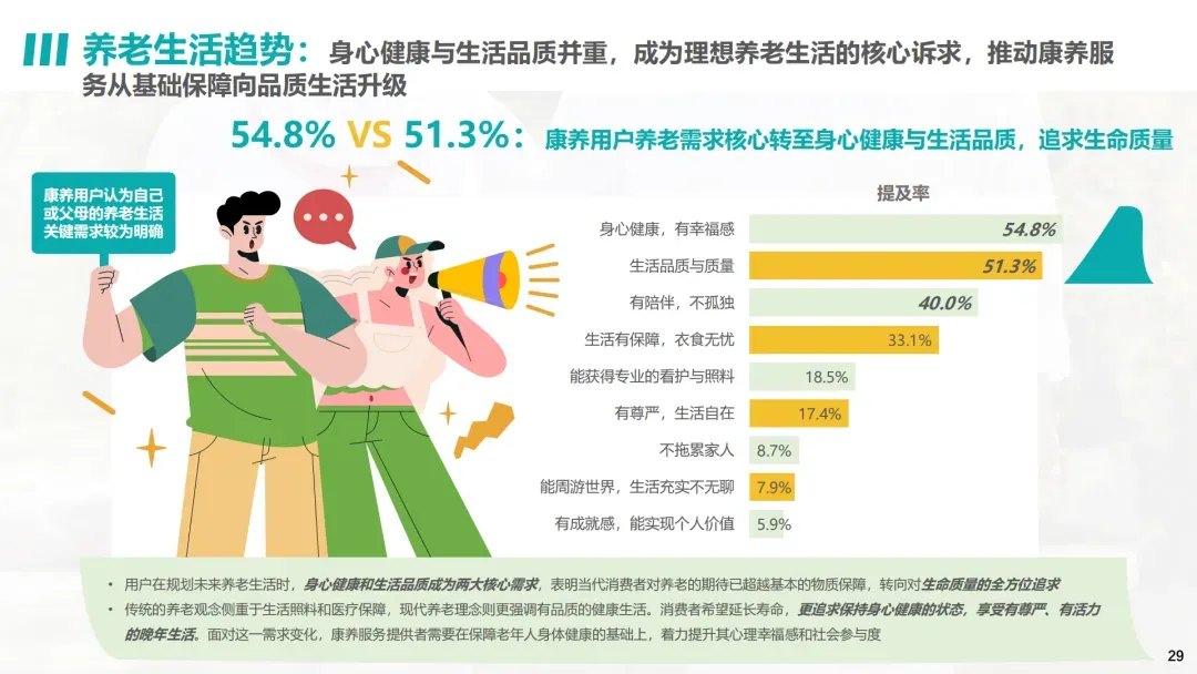用户需求从“生存型养老”向“品质型乐养”转型。身心健康(54.8%)和生活品质(51.3%)成为养老核心诉求,远超衣食无忧(33.1%)、专业看护(18.5%)等传统需求。