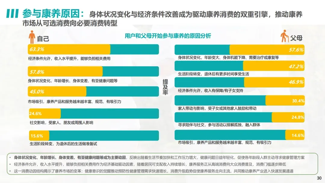 参与康养的核心动因呈现双重驱动特征:身体状况变化(个人提及率57.8%,父母提及率63.3%)和经济条件改善(个人提及率45.0%,父母提及率46.9%)。这表明康养已从可选消费转向必要消费,成为各年龄段人群的生活刚需。