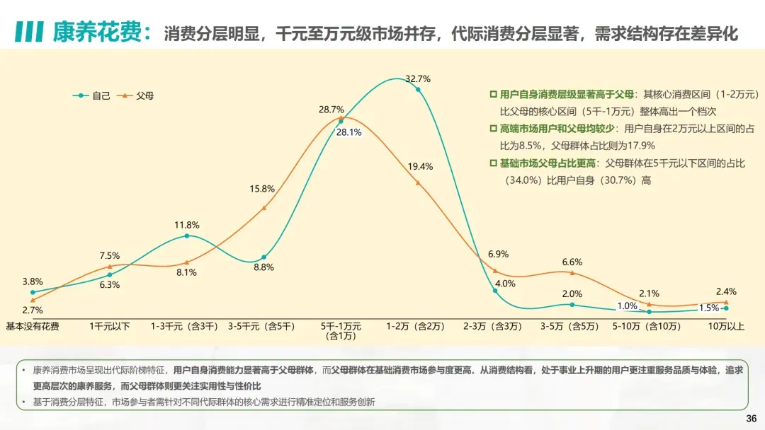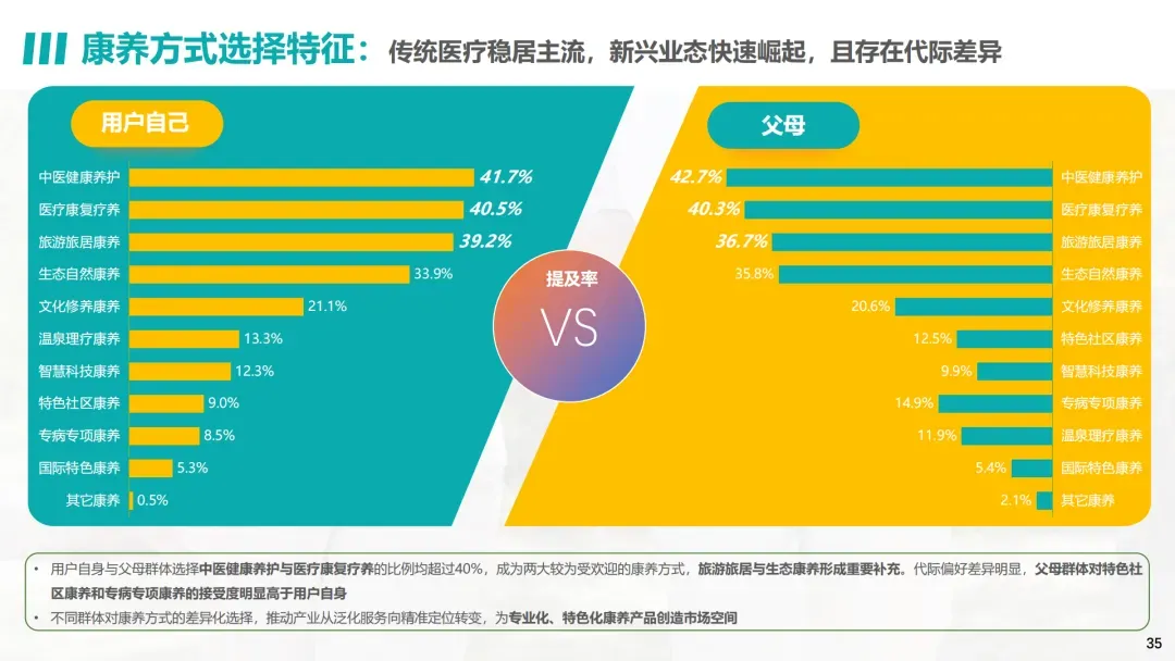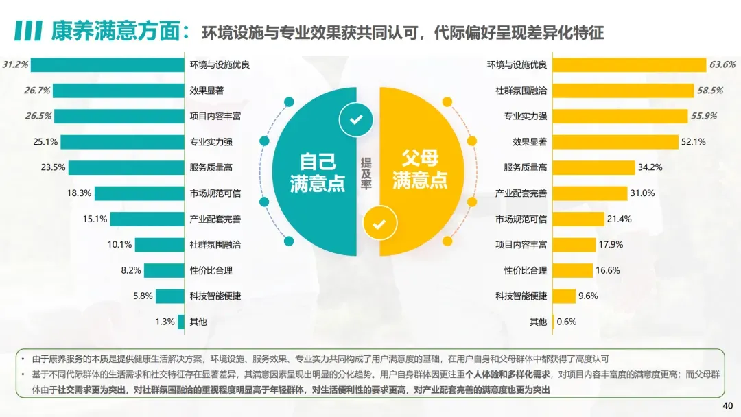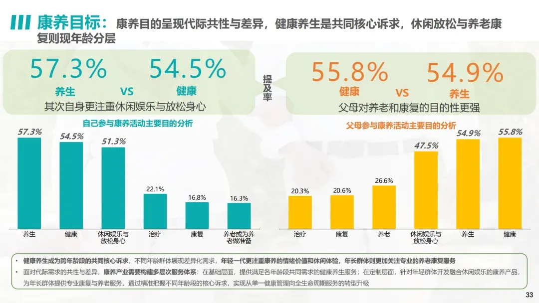 康养消费呈现鲜明的代际共性与差异。健康养生是跨年龄段的核心诉求,个人和父母群体提及率均超过54%;同时,年轻群体更注重休闲娱乐与情绪价值,提及率达51.3%,而年长群体则聚焦养老和康复,提及率为47.5%。这种需求差异推动产业形成多元化服务体系。