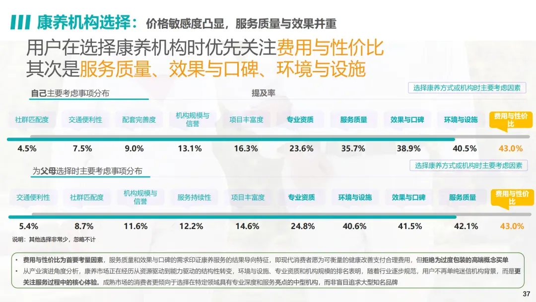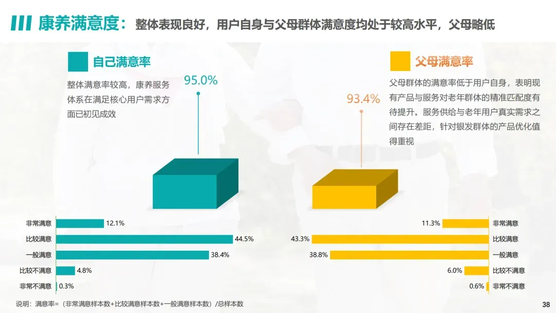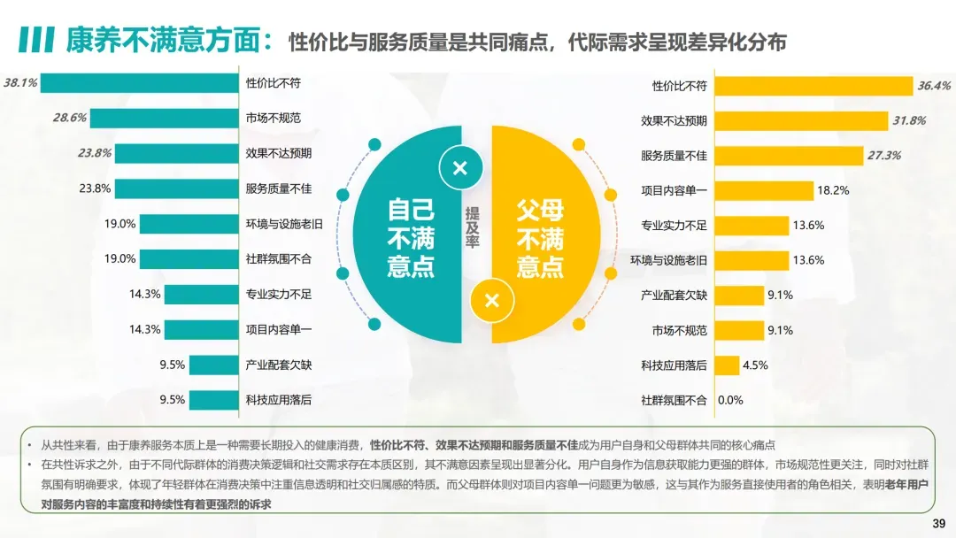 机构选择上,用户决策呈现“结果导向”特征。费用与性价比(个人43.0%,父母43.0%)是首要考量因素,服务质量、效果与口碑、环境与设施紧随其后。这表明消费者愿为可衡量的健康改善支付合理费用,但拒绝过度包装的高端概念。整体满意度较高,个人和父母群体满意率分别达95.0%和93.4%,但性价比不符、效果不达预期、服务质量不佳仍是主要痛点。