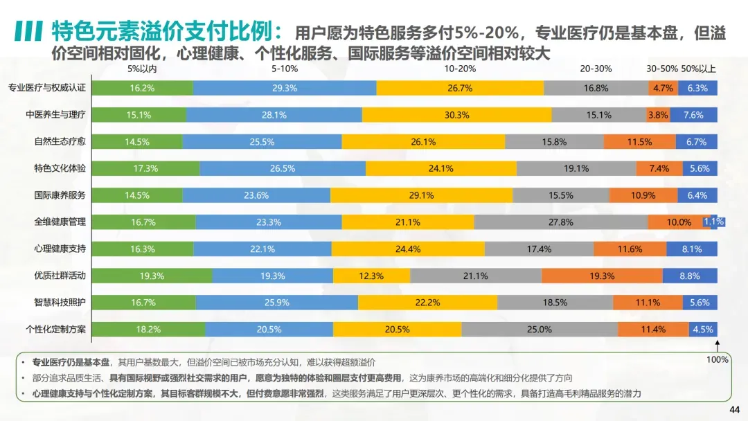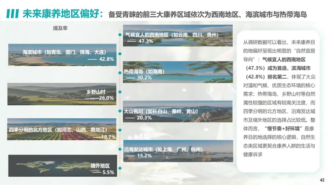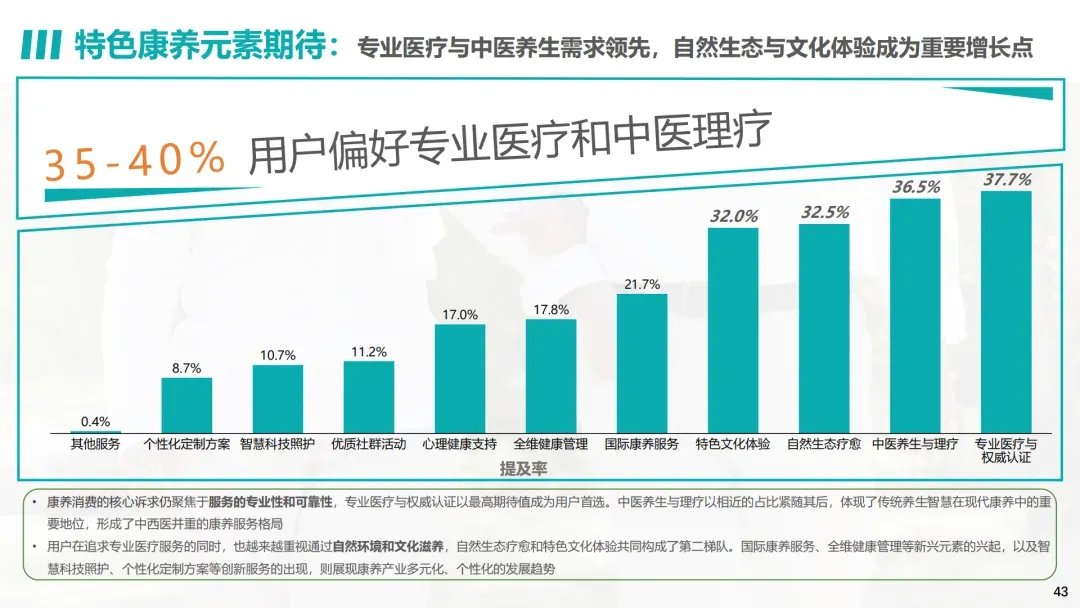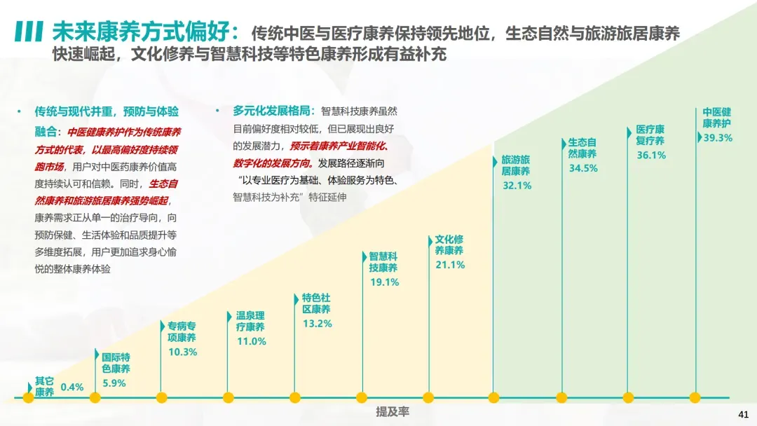 未来消费方向清晰明确。康养目的地偏好“自然宜居导向”,西南地区(47.3%)、海滨城市(42.8%)、热带海岛(30.2%)位列前三,“慢节奏+好环境”成为核心选择逻辑。服务需求上,中医调理保健(43.2%)、营养膳食服务(34.1%)、专业医疗服务(33.5%)最受期待,心理健康关怀、智慧科技照护的需求增长迅速。特色元素方面,本土养生方式更受青睐,中医药文化(40.0%)、茶道与禅修文化(38.3%)、运动与健康管理(35.5%)占据主导,用户愿为特色服务支付5%-20%的溢价。