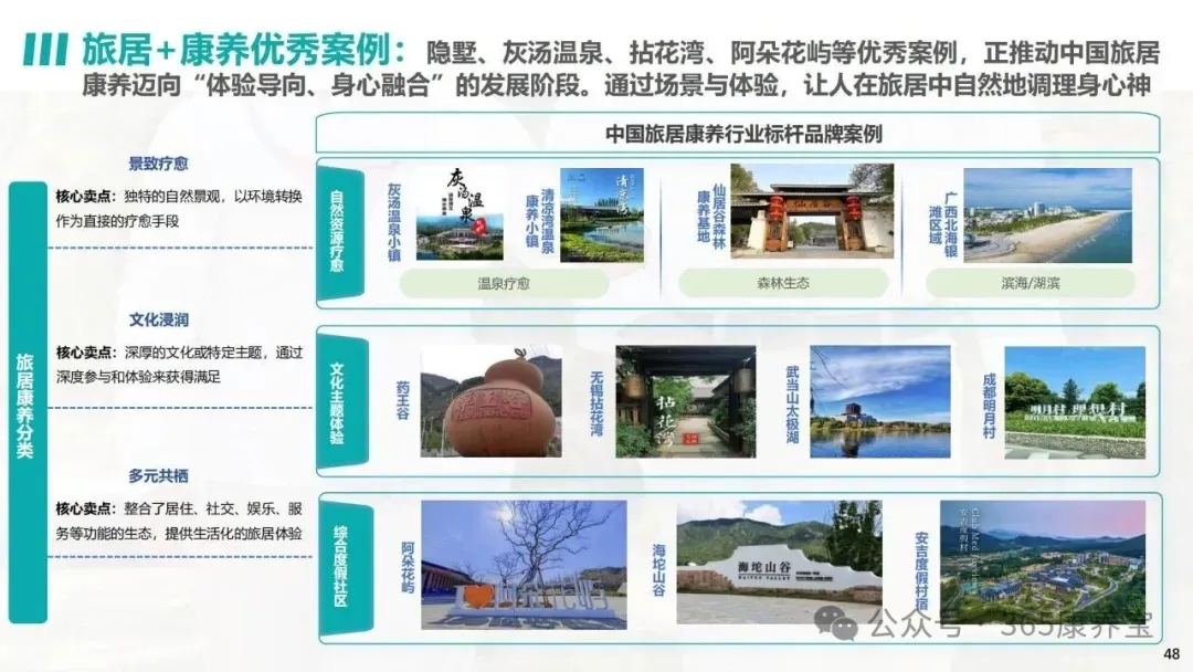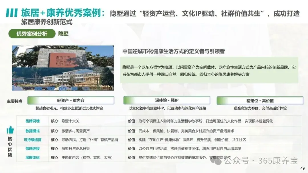 1.旅居+康养赛道以“体验导向、身心融合”为核心,隐墅品牌堪称典范。其以东方哲学为底蕴,激活乡村闲置资产,打造“轻资产运营+文化IP驱动+社群价值共生”的创新范式。通过禅茶、冥想、太极等主题化内容,构建沉浸式体验,联动农民打造有机产品链,实现“在地生产-健康体验”的微循环。灰汤温泉小镇、无锡拈花湾等项目则分别依托自然资源和文化主题,形成差异化竞争力。